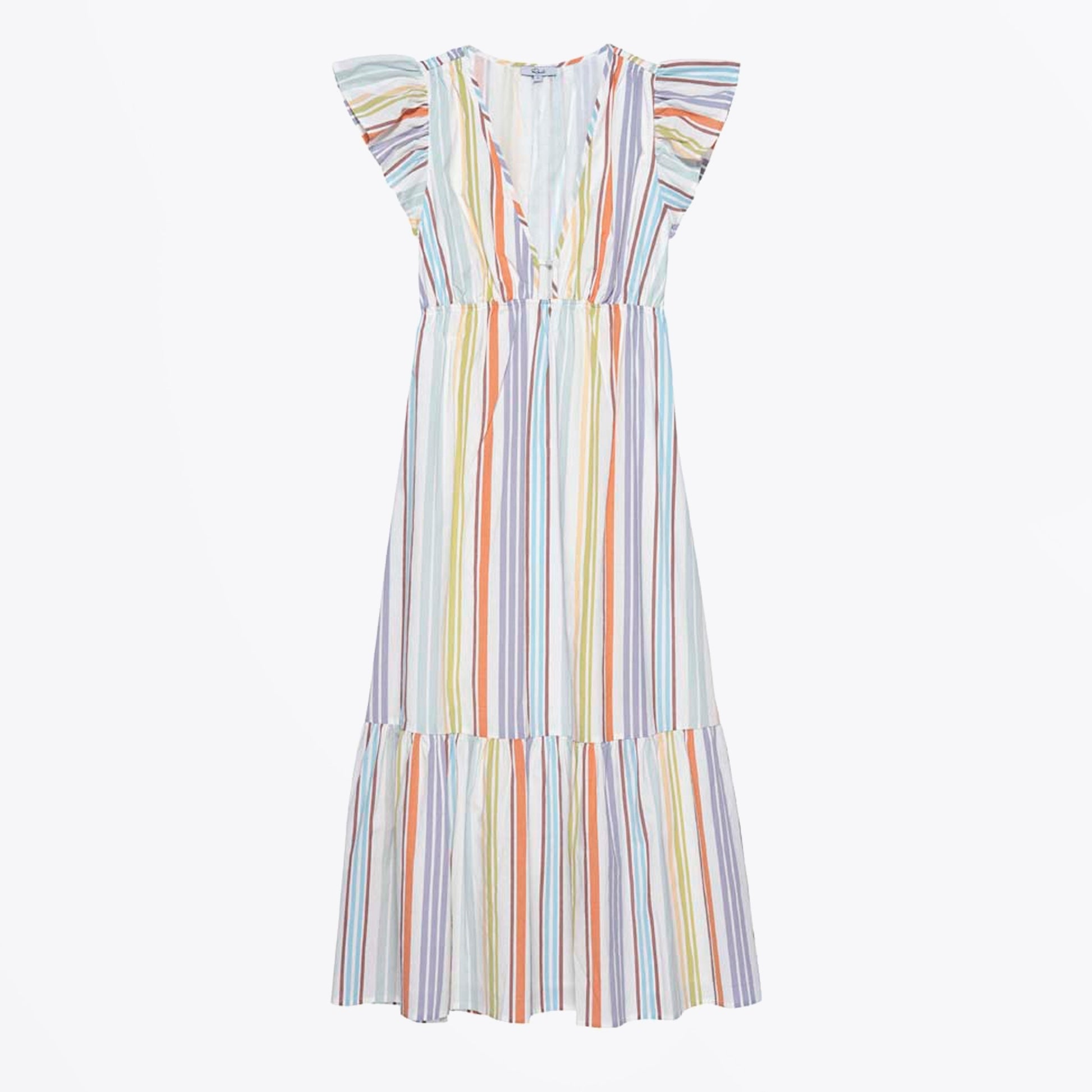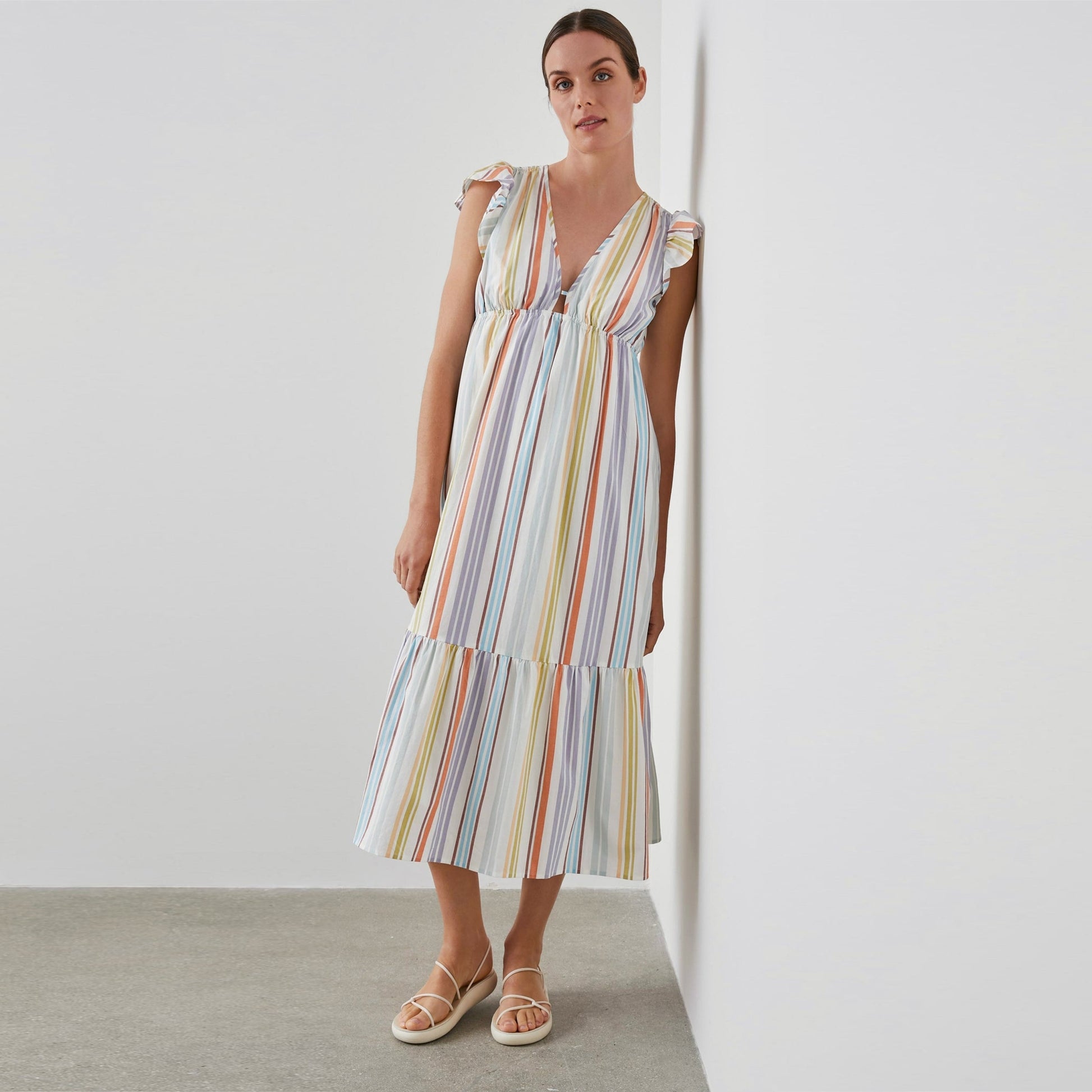 Relaxed and refined label, Rails is synonymous with accessible luxury by using premium fabrications in classic silhouettes and has quickly evolved into a global lifestyle brand. This Tina multicoloured  oasis striped print dress is the perfect piece for the new season. This striking midi dress is perfect for summer day wear or a far off escape. This feminine piece is sure to make you stand out from the crowd. For a no-fuss, effortless look you'll reach for over and over. It includes a v-neckline with a delicate cutout, flutter sleeves, and an empire waist. Rendered in crisp cotton poplin, the tiered, midi dress in pastel stripes is ready for exploring, brunch, even the office. Team with a sandal or casual sneakers for a super stylish look! Time to add a stripe into your wardrobe!
