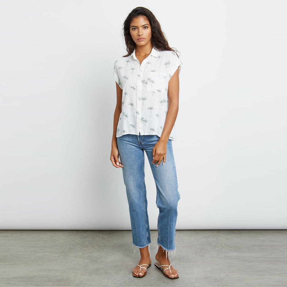 Relaxed and refined label, Rails is synonymous with accessible luxury by using premium fabrications in classic silhouettes, and has quickly evolved into a global lifestyle brand.  This luxe linen, short sleeve, warm ivory buttondown shirt featuring green sketched palm tree print throughout, relaxed fit, patch pocket at chest, rolled sleeves, flattering side slits, and high-low hem. Lightweight, breezy linen fabric mixed with a relaxed body shape makes the Whitney the perfect Southern California inspired button-down.