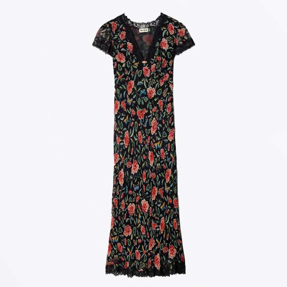 Rixo story began in 2015 at the living room of founders and best friends Henrietta and Orlagh. Their love of vintage style clothing inspired them to bring this vintage style to the modern day. Rixo focuses on hand painted prints using premium materials and vintage inspired silhouette, with the goal of making you feel your very best. This RIXO Clarice Dress in Butterfly Floral Black blends romance and versatility in a signature silhouette. Crafted from lightweight crinkled chiffon with a striking butterfly floral print on a black base, this midi dress features a classic V-neckline that conceals a bra, cap sleeves, a side concealed zip, and an empire underbust seam for an elongating effect. With its bias cut and full lining, Clarice moves beautifully and suits both daytime wear and after-dark styling.