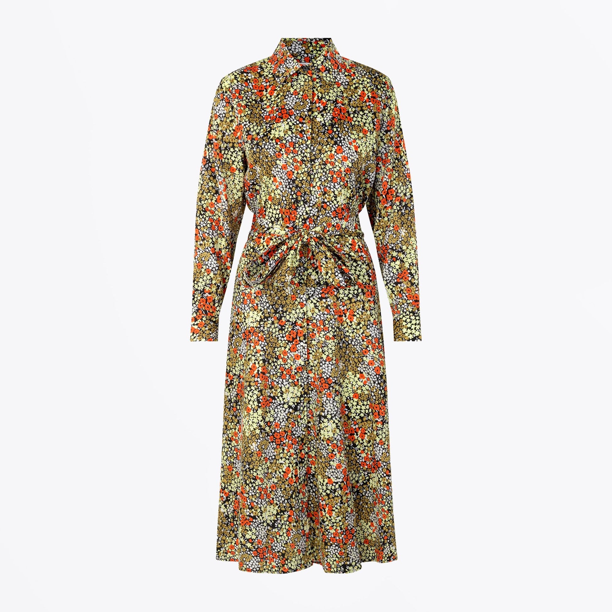 With a nod to its Scandinavian heritage, Sams��e Sams��e is defined by a wearable aesthetic that combines the utilitarian ease of Copenhagen street-style with a quintessentially Scandinavian spirit. Collections transcend trends, drawing on Denmark’s renowned design tradition to result in minimalist, affordable and accessible fashion. This ‘Asta’ shirt dress is a great day to night option for your new season wardrobe. Featuring a fun pussy bow collar and high neckline, this dress has a playful floral print in orange and yellow tones on a black background, making the colours appear luminant. Style this dress with some Veja trainers for a daytime look, or with some simple black heels for a cute dinner date outfit.