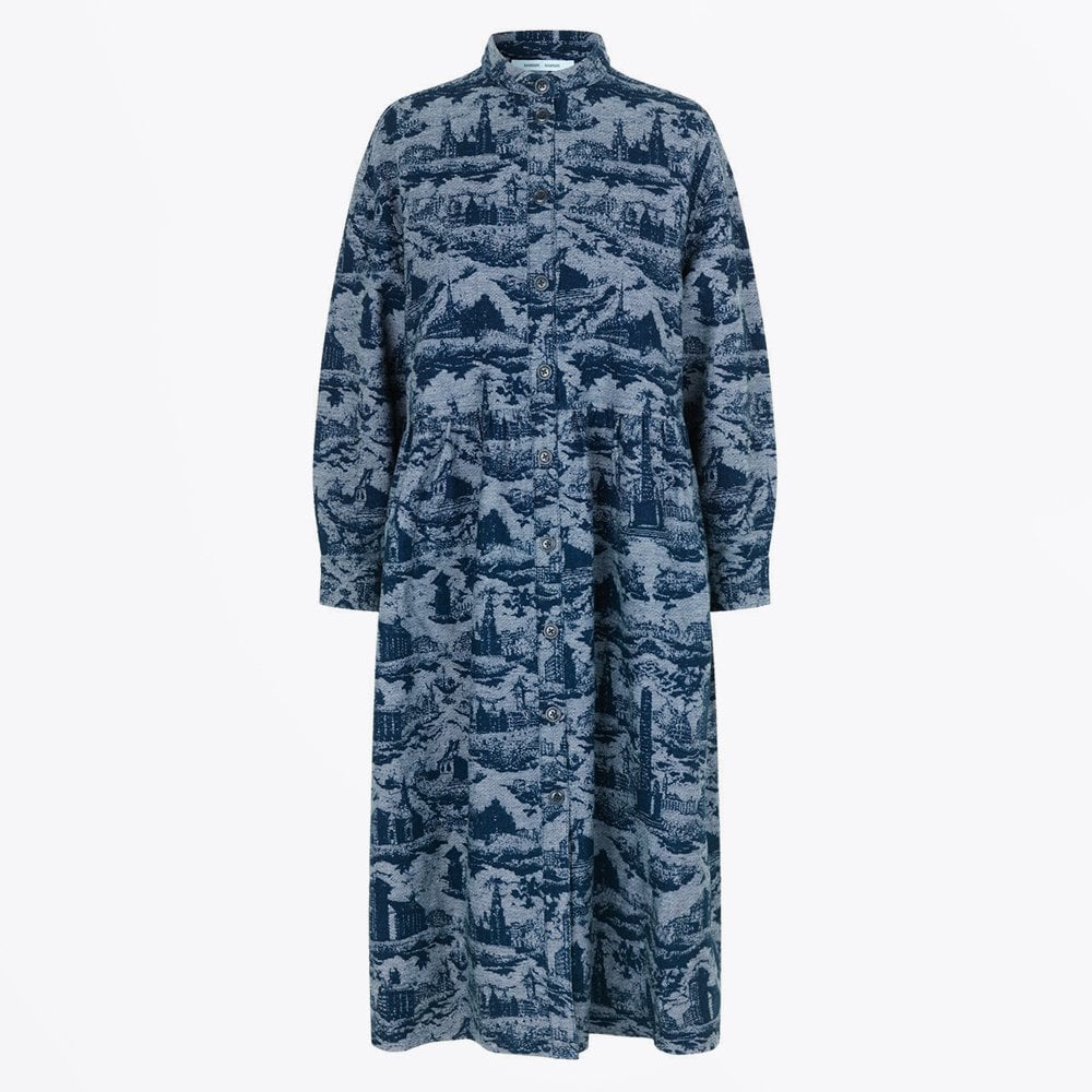 Oversized midi length shirt dress with long sleeves. Mandarin collar, button fastening center front and cuffs. Gathered waist. Side seam pockets. 100% cotton fabric with jacquard pattern.