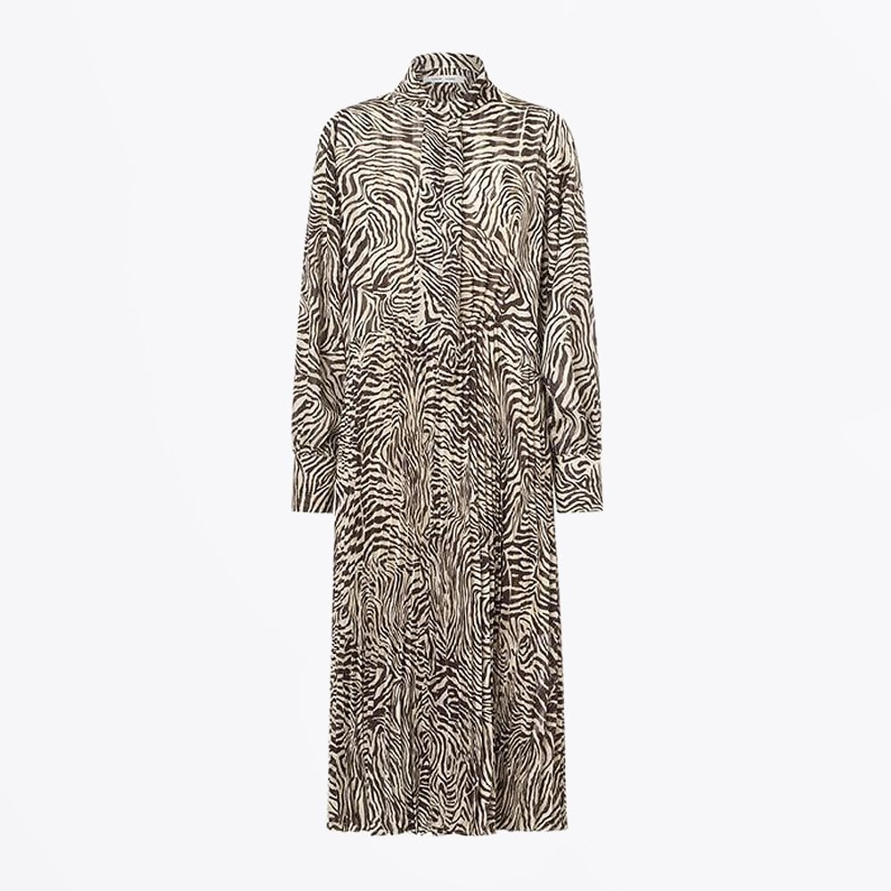With a nod to its Scandinavian heritage, Sams��e Sams��e is defined by a wearable aesthetic that combines the utilitarian ease of Copenhagen street style with a quintessentially Scandinavian spirit. Collections transcend trends, drawing on Denmark’s renowned design tradition to result in minimalist, affordable and accessible fashion. This Samsoe & Samsoe loose fitting printed dress features tie fastening collar and front slit, pleated skirt and back panel and long sleeves with button fastening cuffs. This dress also has a detachable slip dress lining and is crafted in a recycled polyester blend fabric with woven texture and printed pattern. A versatile and stylish dress perfect for the A/W season.