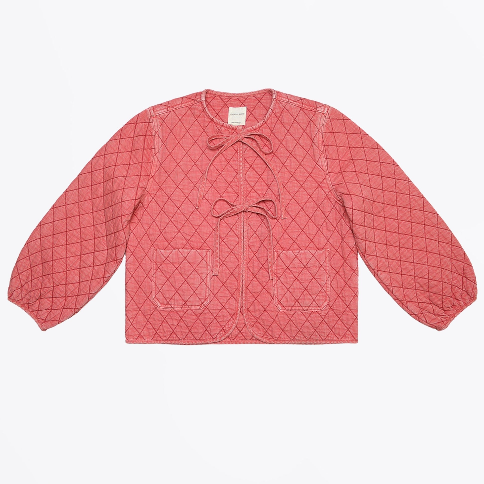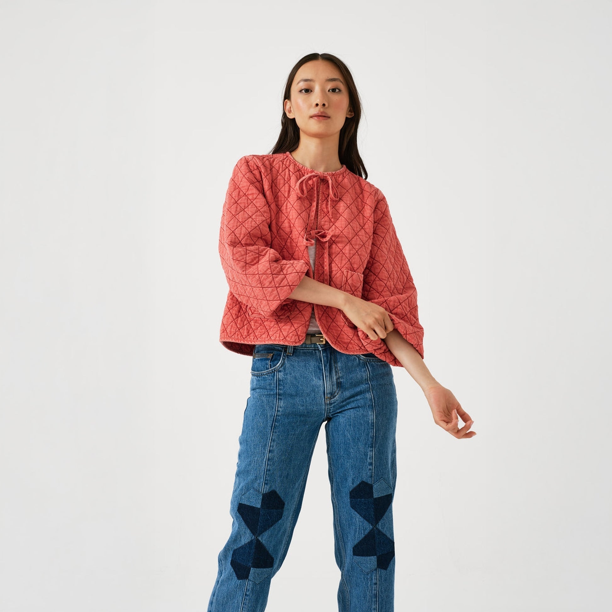 Introducing to our Mrs Stitch SS 25 collection Seventy & Mochi. The brand is female led created in 2020 and specialises in luxury denim items. The brand is a tribute to traditional craftsmanship and working women and is dedicated to uplifting marginalized communities by providing unbiased, equal employment and collaborating with female entrepreneurs. Add some luxury denim to your wardrobe with this option from Seventy & Mochi. This Aria Jacket in mineral red features a patchwork heart on the back, tie fastening front, long sleeve design, quilted denim and straight hem. Wear this jacket with the ecru bay jeans and a pair of Hoff sneakers