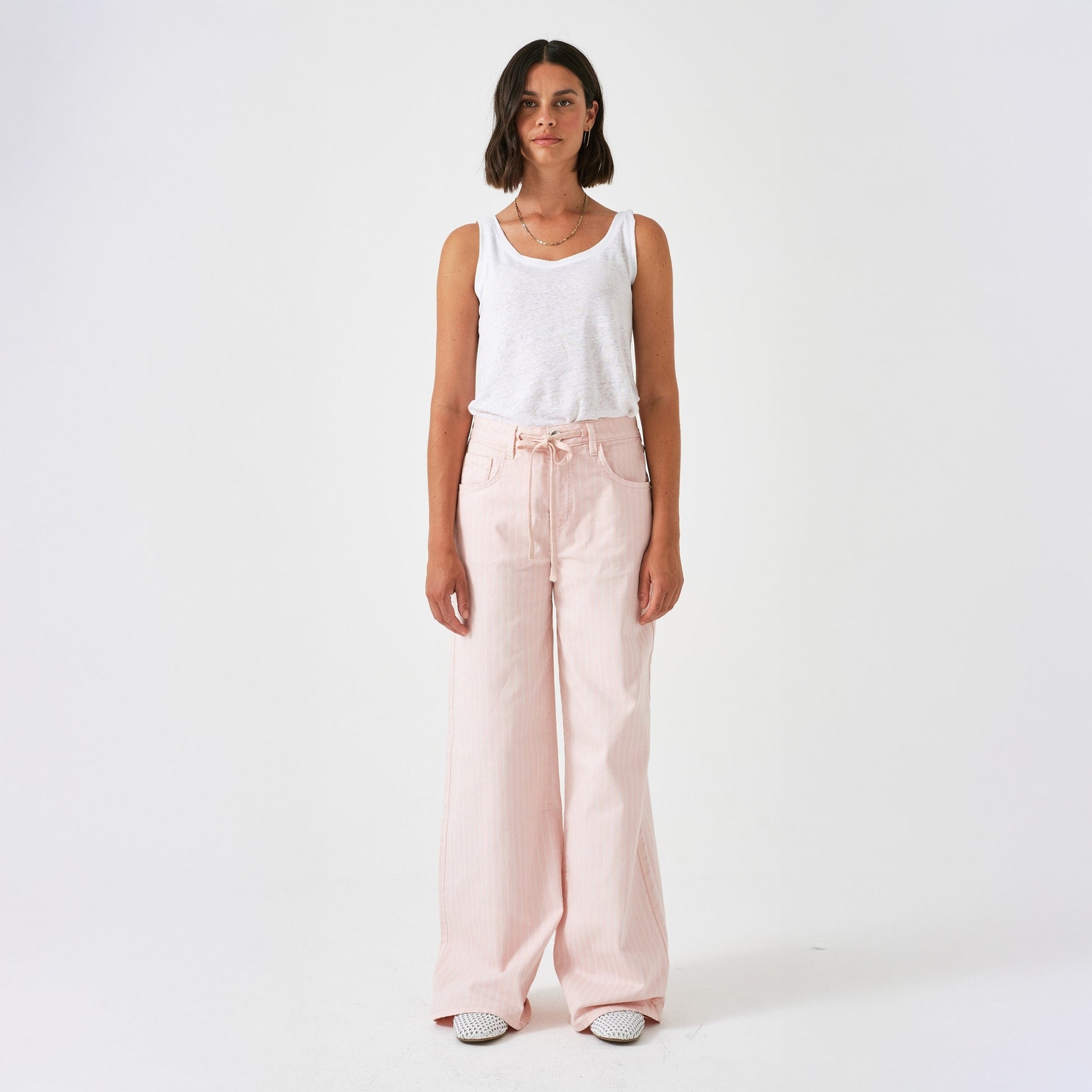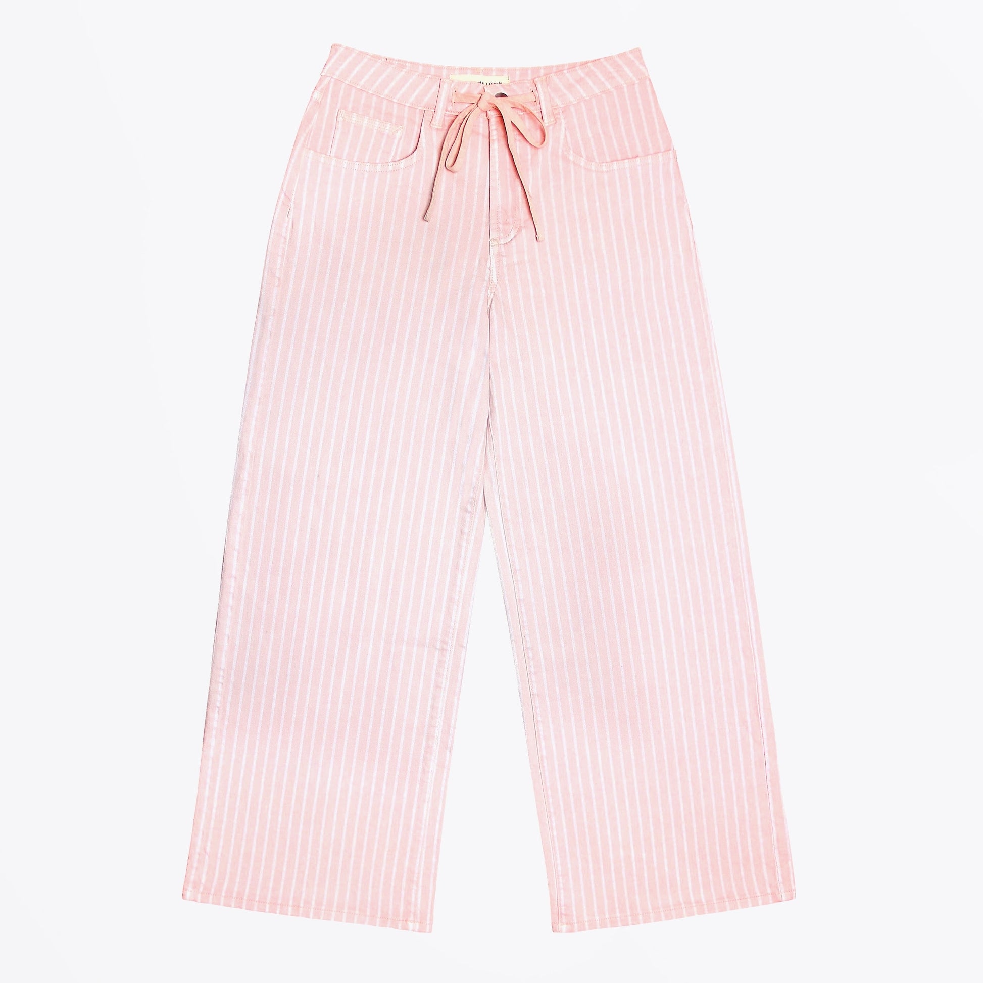 Introducing to our Mrs Stitch AW 24 collection Seventy & Mochi. The brand is female led created in 2020 and specialises in luxury denim items. The brand is a tribute to traditional craftsmanship and working women and is dedicated to uplifting marginalized communities by providing unbiased, equal employment and collaborating with female entrepreneurs. Add some luxury denim to your wardrobe with this option from Seventy & Mochi. Similar to the Gracie Jean, the Blake Jean features a low-rise, wide-leg silhouette, complemented by a self-fabric tie for a laid-back, relaxed style. This is Blake in a pink stripe, she's super summery and fresh. Wear these jeans with a Skall tee and a pair of Hoff sneakers.