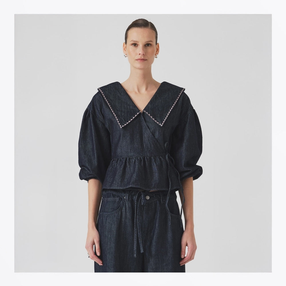 Introducing to our Mrs Stitch SS 25 collection Seventy & Mochi. The brand is female led created in 2020 and specialises in luxury denim items. The brand is a tribute to traditional craftsmanship and working women and is dedicated to uplifting marginalized communities by providing unbiased, equal employment and collaborating with female entrepreneurs. Add some luxury denim to your wardrobe with this option from Seventy & Mochi. This Nour blouse features a Peter Pan collar, frilled wrap top, pink stitched details and tie up fastening. Wear this blouse with some Paige jeans and a pair of Victoria sneakers.