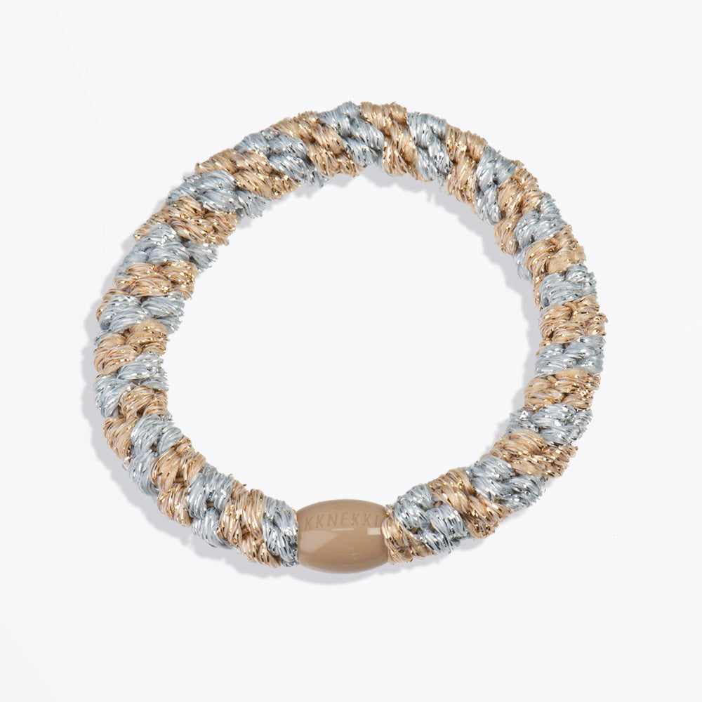 Meet the Silver Beige Glitter Stripe KKNEKKI – the hair tie that's been perfected since 1987. This iconic woven design delivers a secure, gentle hold without pulling, snagging, or damaging your hair, even during intense workouts or long days. Waterproof and fade-resistant, it withstands daily wear with effortless durability. Finished with a recycled plastic bead, this style merges sustainability with sophistication. The shimmering glitter stripe adds understated elegance, whether securing your hair or worn as a wrist accessory. Suitable for all hair types, KKNEKKI is the versatile essential that adapts to your lifestyle.
