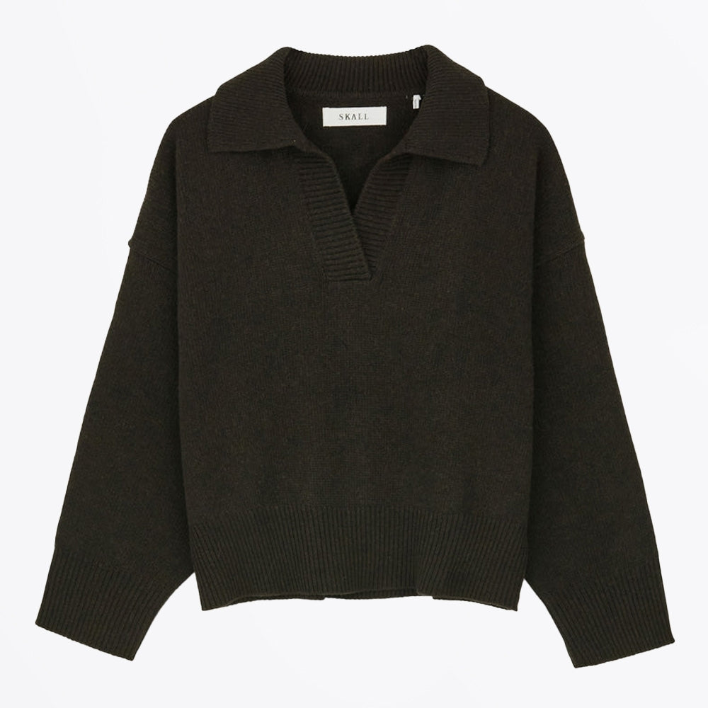 The Skall Studio Dean V-Neck Jumper in Deep Brown combines timeless design with sustainable craftsmanship. Made from 100% merino wool, this oversized knit features a cross-over V-neck that opens into a wide ribbed collar. The dropped shoulder sleeves are wide and are finished with a deep rib, as is the body. Designed in a loose silhouette falling freely on the body, this jumper offers comfort and versatility for various occasions.