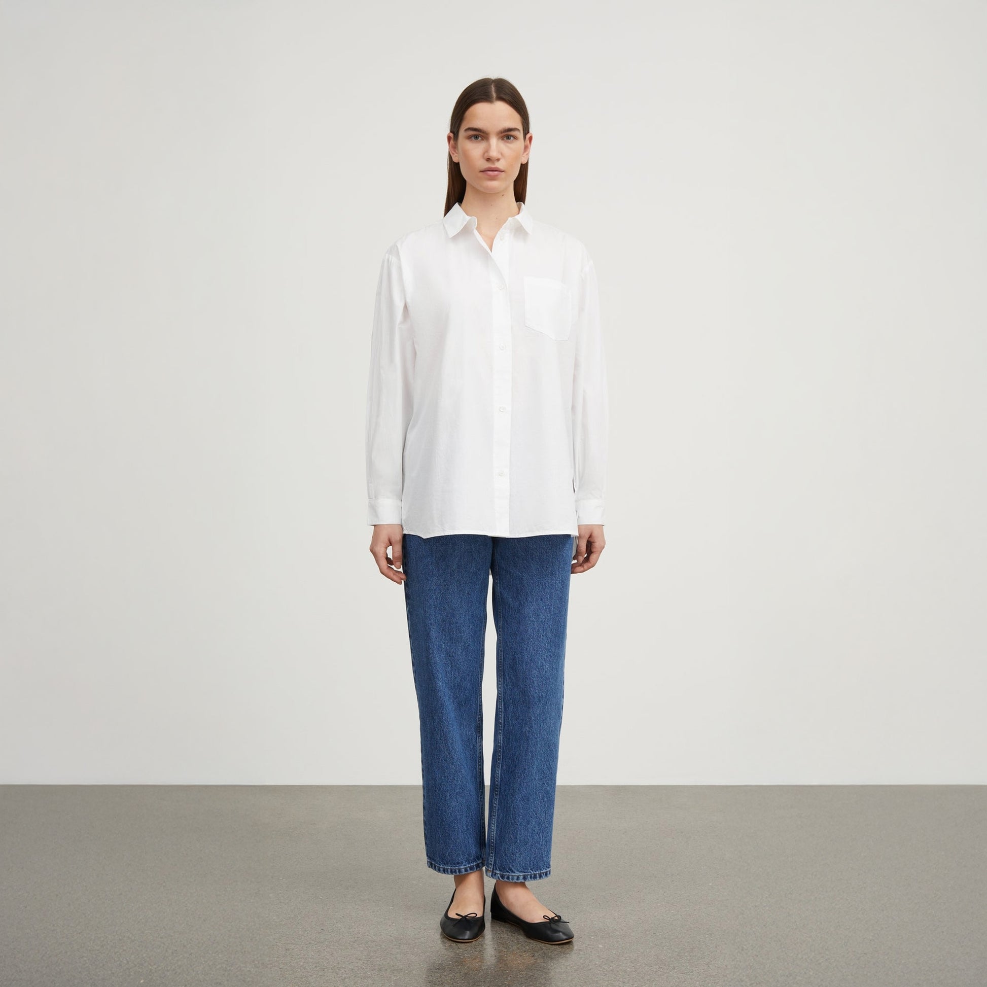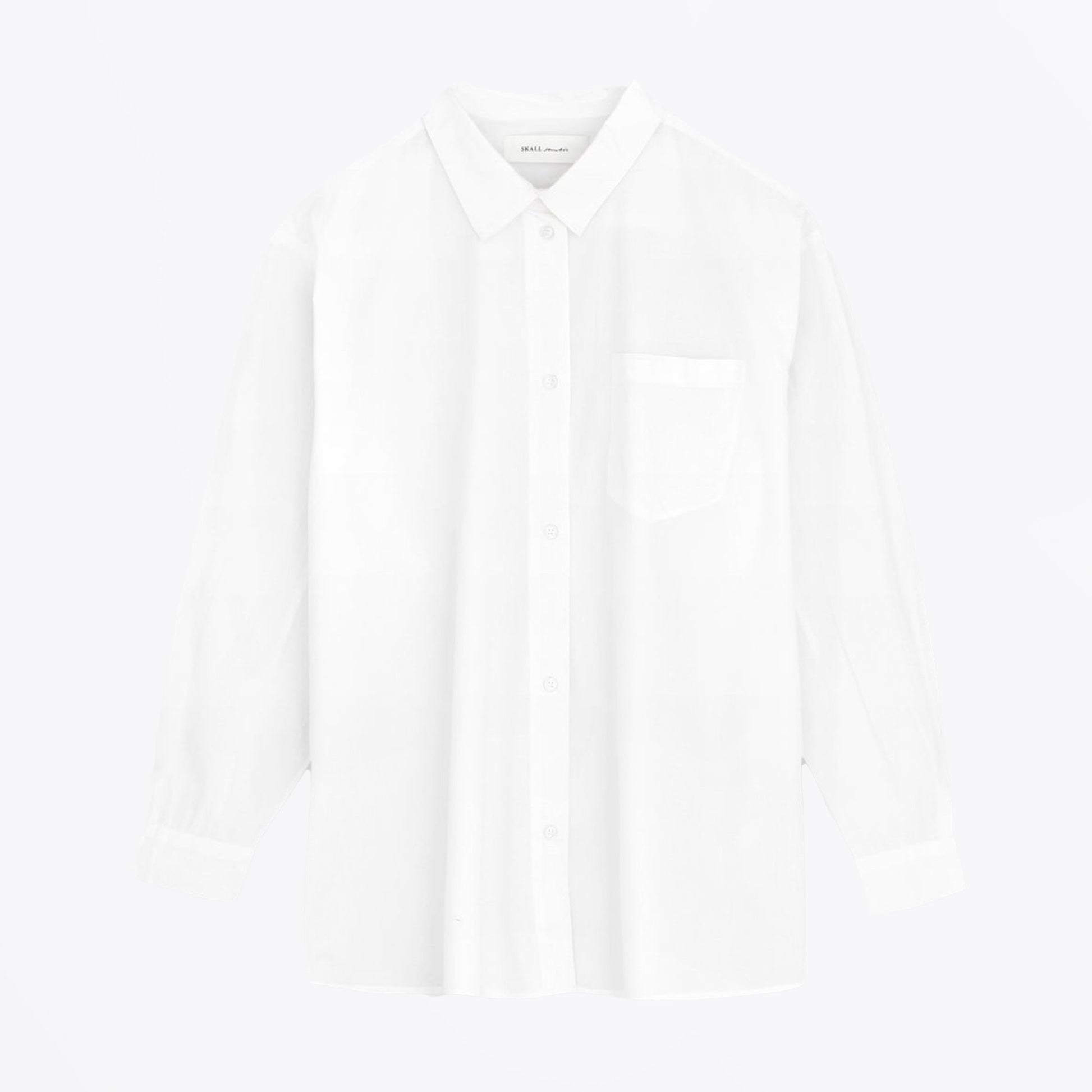 The Skall story started in the coastal area of Northern Jutland where Julie and Marie’s great-grandfather and his brothers collected seashells and sold them for chicken feed to earn a living. This is also how the family got its last name Skall, meaning seashell in Danish. Today the seashells are still a source of inspiration. The seashells remind them that nature, animals and humans are closely connected – and of their ancestors’ simple way of living. That less is enough. Values that the sisters wish to pass on to everyone buying a Skall piece. Update your wardrobe staples with this option from Skall Studio. This Edgar shirt is crafted in an organic cotton poplin for a casual everyday  look. This optic white Edgar shirt features a long sleeve an oversized menswear fit. This perfect shirt will add to a cool relaxed look your SS.
