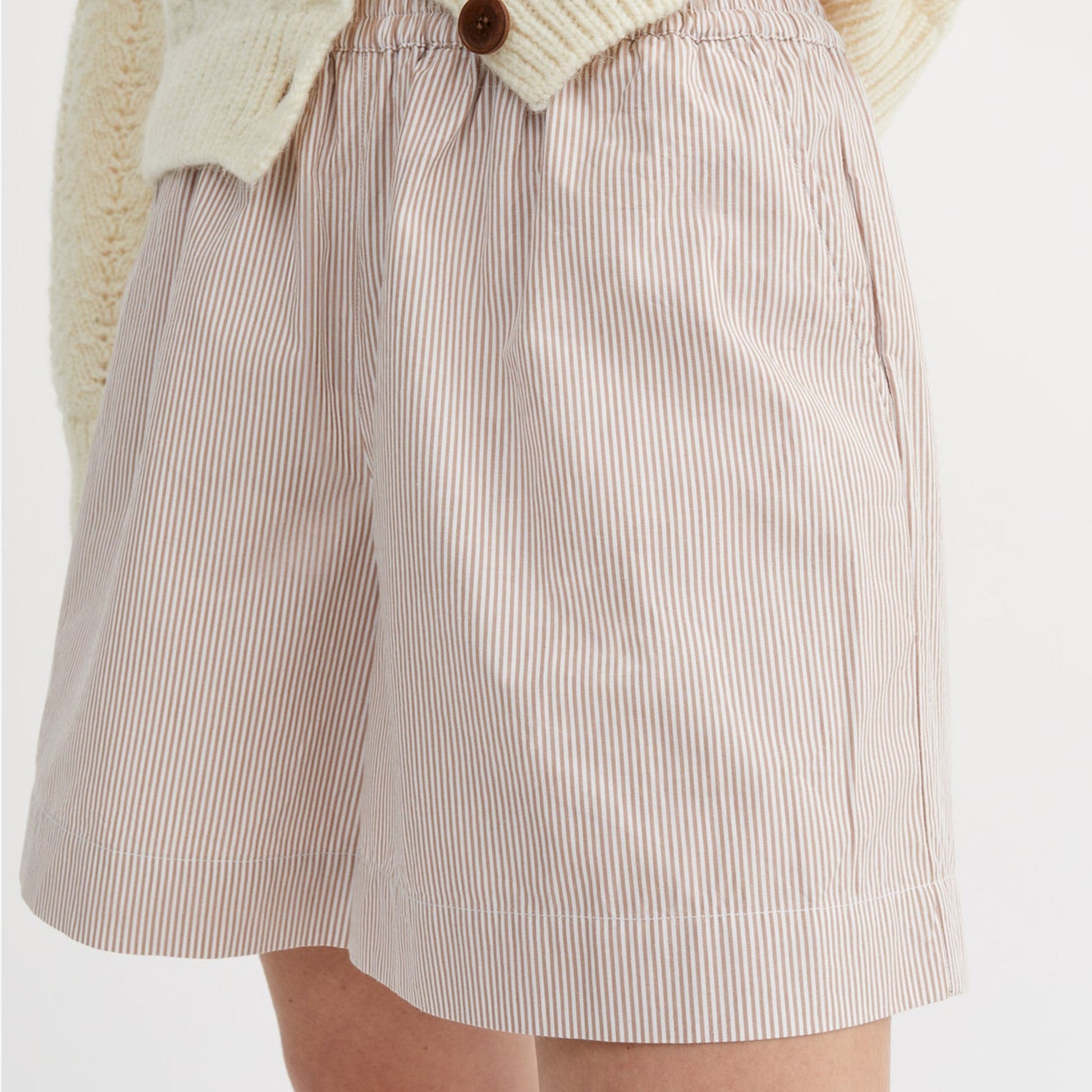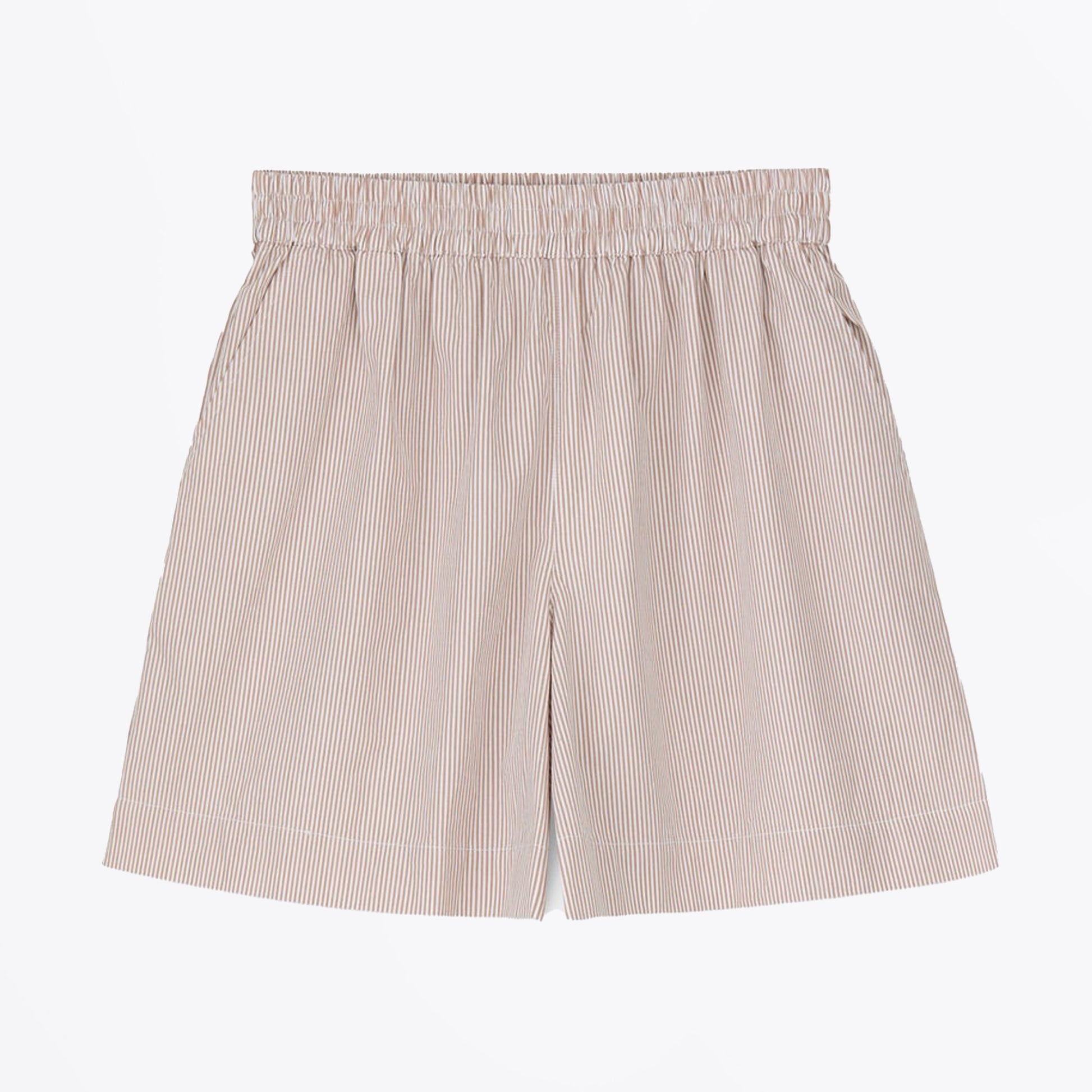 The Skall story started in the coastal area of Northern Jutland where Julie and Marie’s great-grandfather and his brothers collected seashells and sold them for chicken feed to earn a living. This is also how the family got its last name Skall, meaning seashell in Danish. Today the seashells are still a source of inspiration. The seashells remind them that nature, animals and humans are closely connected – and of their ancestors’ simple way of living. That less is enough. Values that the sisters wish to pass on to everyone buying a Skall piece. Update your wardrobe staples with this option from Skall Studio. These Edgar shorts is crafted in organic cotton in a white and beige stripe for a casual summer look. These Edgar shorts feature an elastic waistband with side pockets and offers an elevated relaxed look this SS.