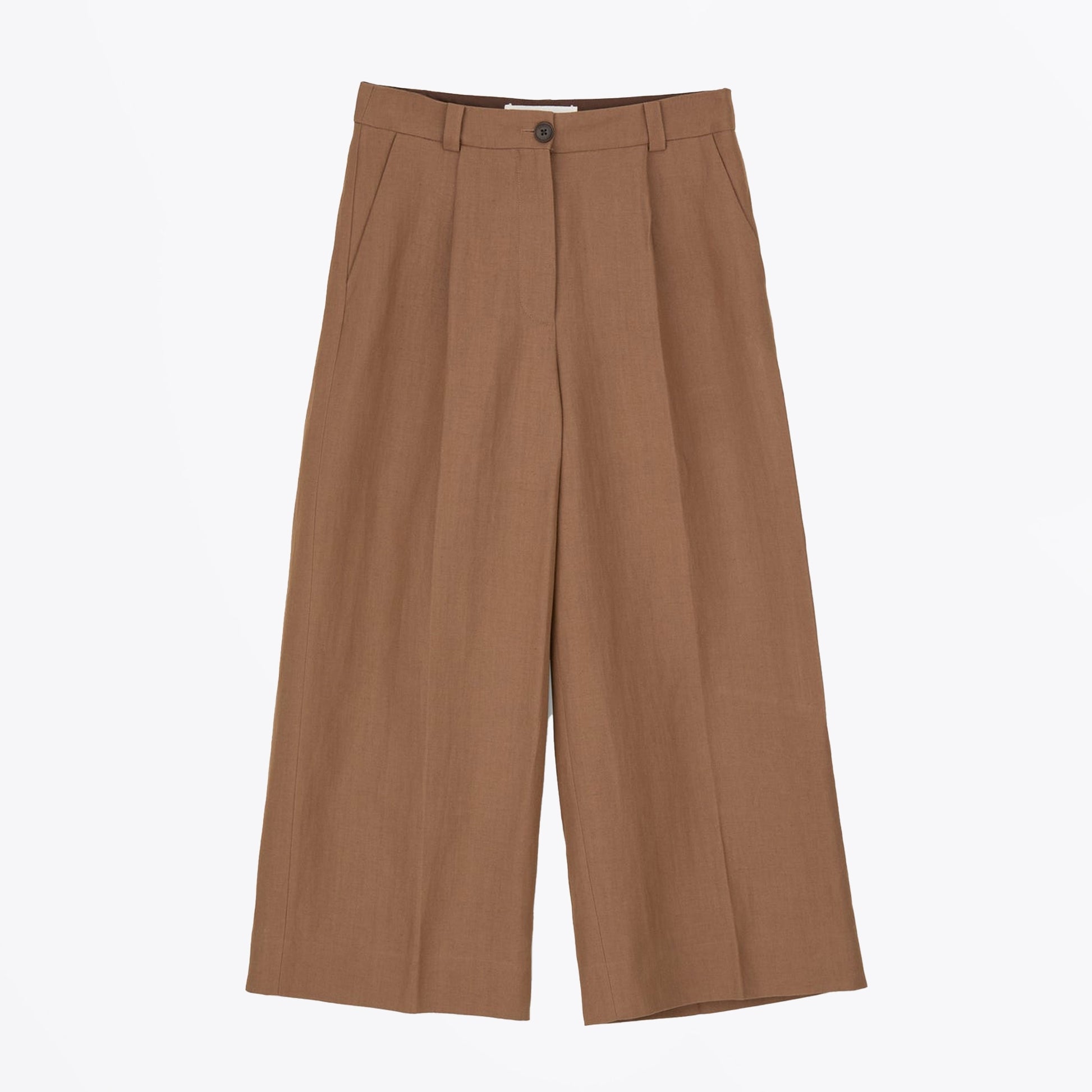 The Skall story started in the coastal area of Northern Jutland where Julie and Marie’s great-grandfather and his brothers collected seashells and sold them for chicken feed to earn a living. This is also how the family got its last name Skall, meaning seashell in Danish. Today the seashells are still a source of inspiration. The seashells remind them that nature, animals and humans are closely connected – and of their ancestors’ simple way of living. That less is enough. Values that the sisters wish to pass on to everyone buying a Skall piece. Update your wardrobe staples with this option from Skall Studio. These Emmeri warm brown cropped trousers are crafted in a linen/recycled cotton mix for a casual look. Inspired by mens trousers, these Emmeri trousers feature a low waist, crease lines in the front, side pockets, visible front button and they offer a versatile wearability for a cool relaxed look this summer.