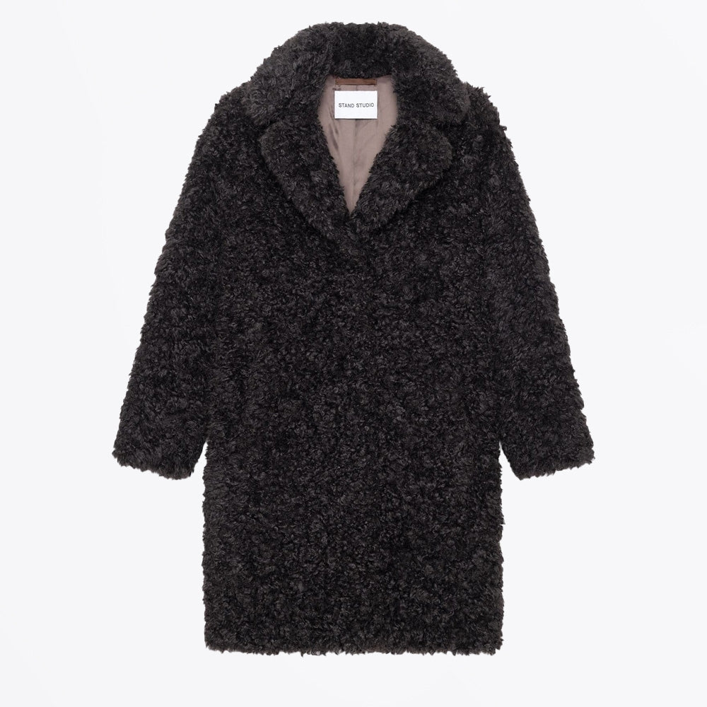 The Stand Studio Camille Cocoon Coat in Dark Chocolate offers a blend of elegance and comfort. Made from soft curly faux fur, this coat features a relaxed cocoon silhouette with dropped shoulders, a notched collar, and a concealed snap-button closure. The design includes side slit pockets and an internal zip pocket, providing both style and functionality. Fully lined for comfort, this coat is a versatile addition to any wardrobe, perfect for layering over both casual and formal outfits.