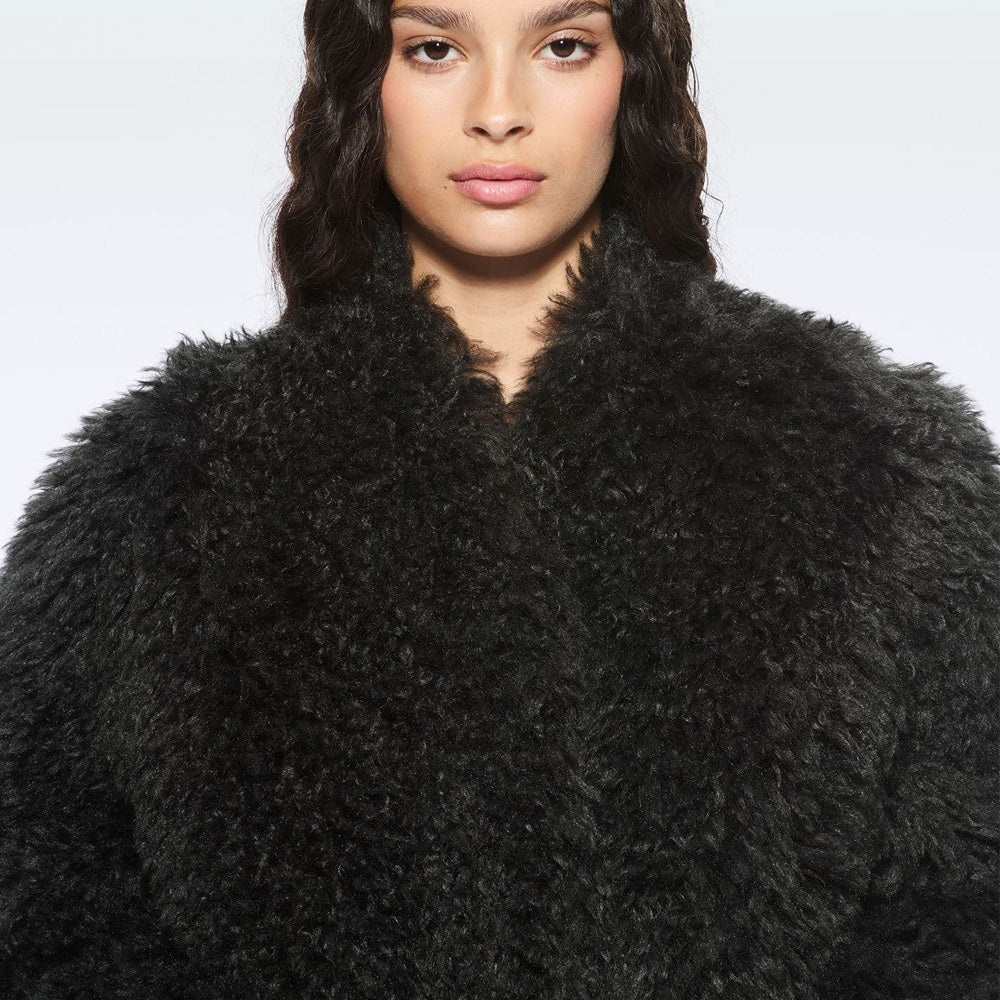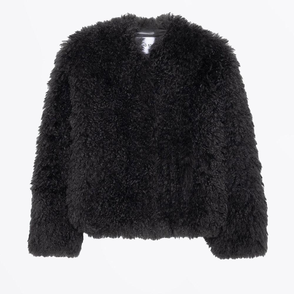 The Stand Studio Charlotte Jacket in Smoke Grey is a luxurious addition to any winter wardrobe. Made from soft faux shearling, this jacket features a straight, hip-length silhouette that provides both warmth and style. The hidden hook-and-eye closures maintain a clean look, while the in-seam pockets add functionality without compromising the jacket's sleek design. Fully lined for comfort, the Charlotte Jacket offers a polished finish suitable for both casual and formal occasions.