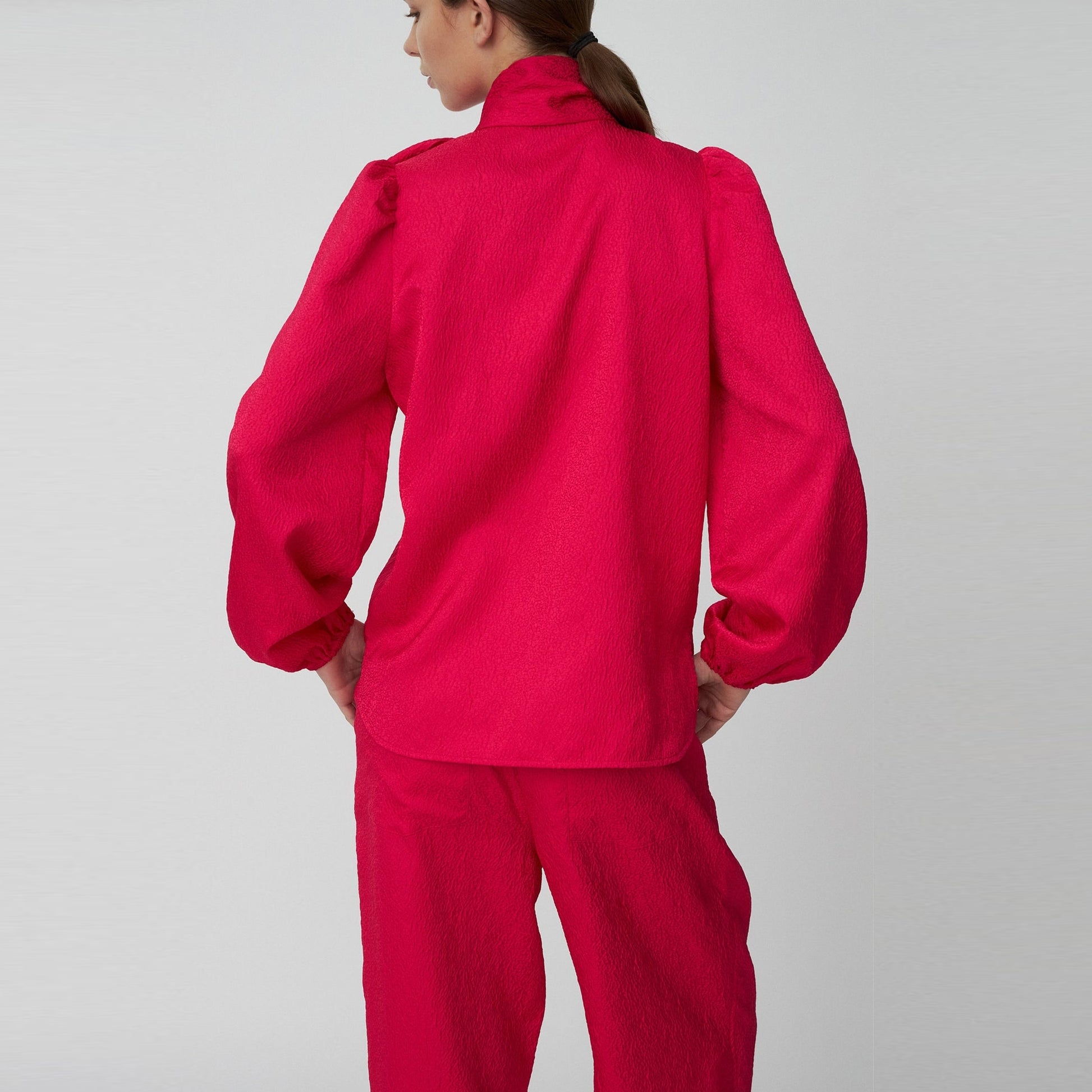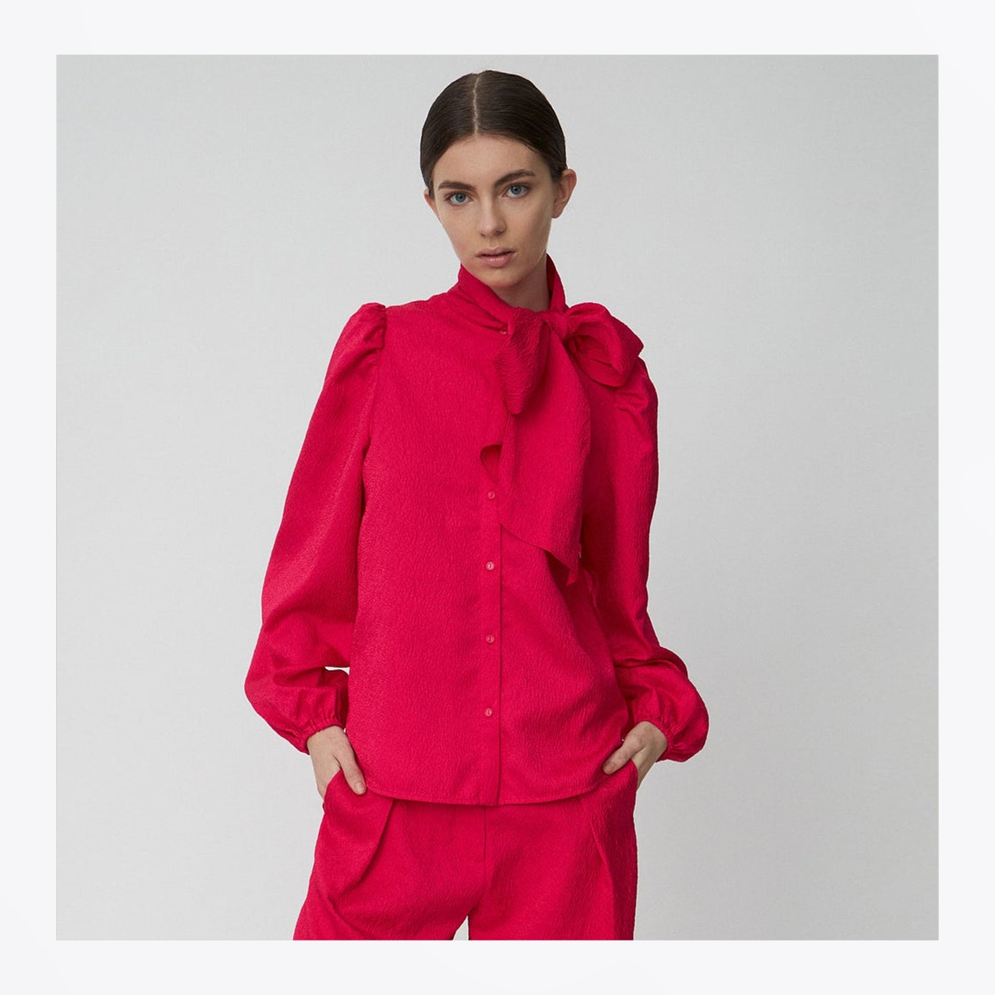 Introducing Stella Nova to Mr & Mrs Stitch. Founded in 2002 by designer and creative director Trine Skoller, Stella Nova's focal point is the creation of the perfect must-have wardrobe where every style consists of little treasures, that each tell their own story. The playful universe of Stella Nova creates unique styles that women will want in their wardrobe now and forever. This shirt features a vibrant wild cherry colour crafted from a textured polyester and nylon material. It includes a bow thee around the colour collar, light long puffed sleeves, button up fastening and elasticated wrists. Wear this blouse with some Skall jeans and Mexicana boots.