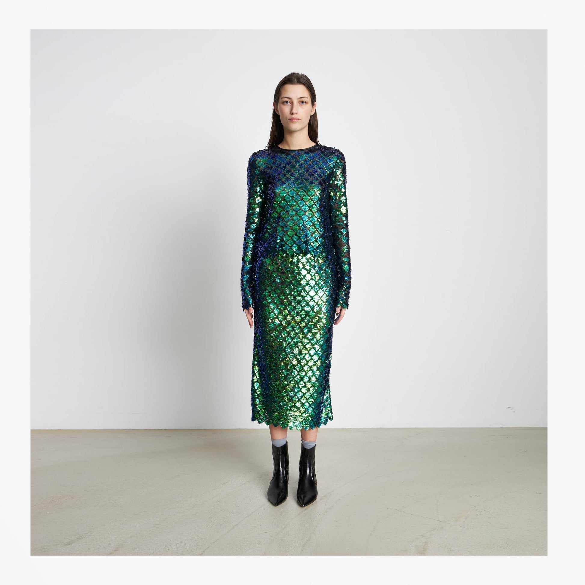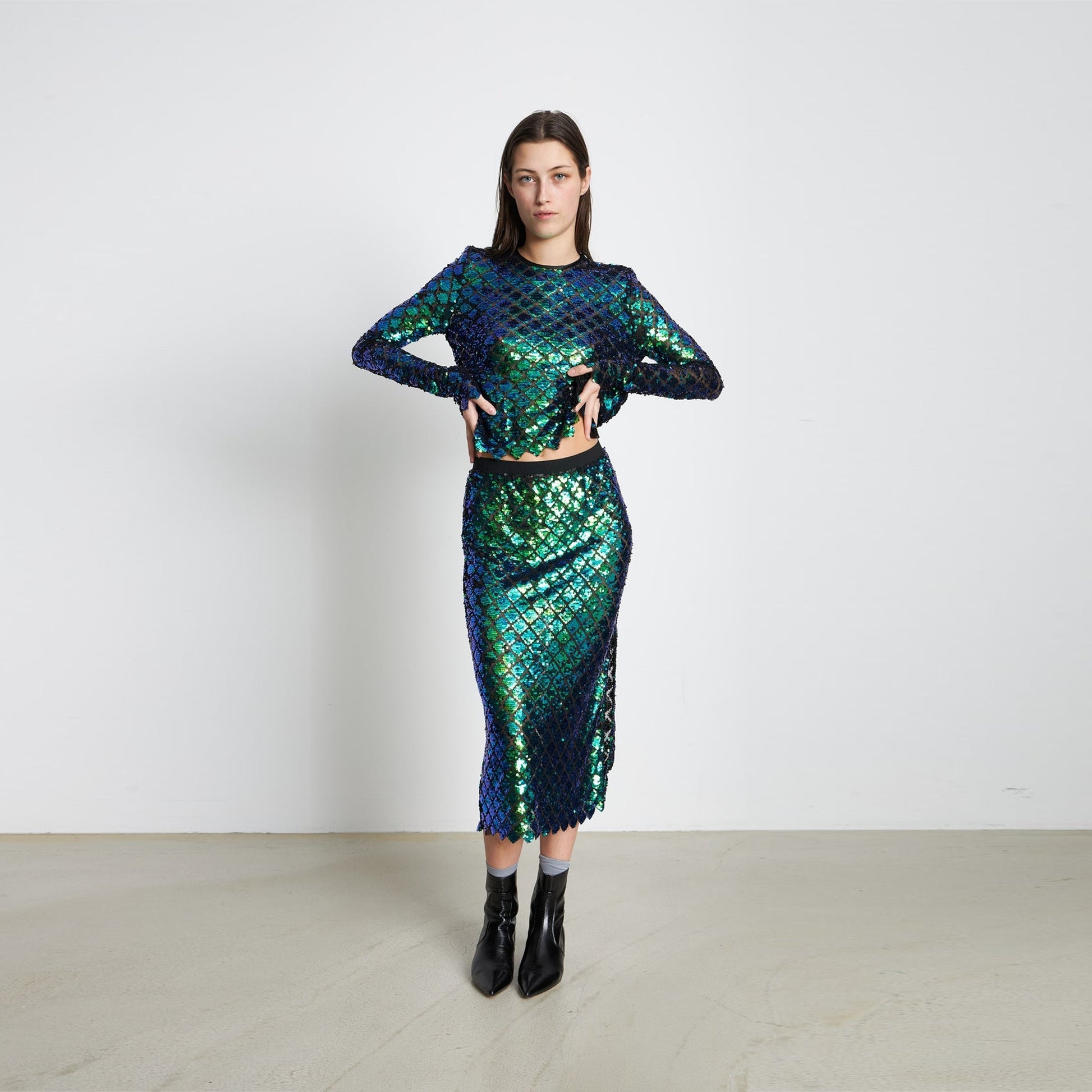 Introducing one of our newest labels, Stella Nova to Mr & Mrs Stitch. Founded in 2002 by designer and creative director Trine Skoller, Stella Nova's focal point is the creation of the perfect must-have wardrobe where every style consists of little treasures, that each tell their own story. The playful universe of Stella Nova creates unique styles that women will want in their wardrobe now and forever. Add a fun skirt to your wardrobe this season with this piece, featuring a harlequin sequin design, on a black base. This features an elastic waistline, cut below the knee with a slide slit. Wear this skirt with matching top or make it casual with plain oversized knit and channel your inner mermaid.