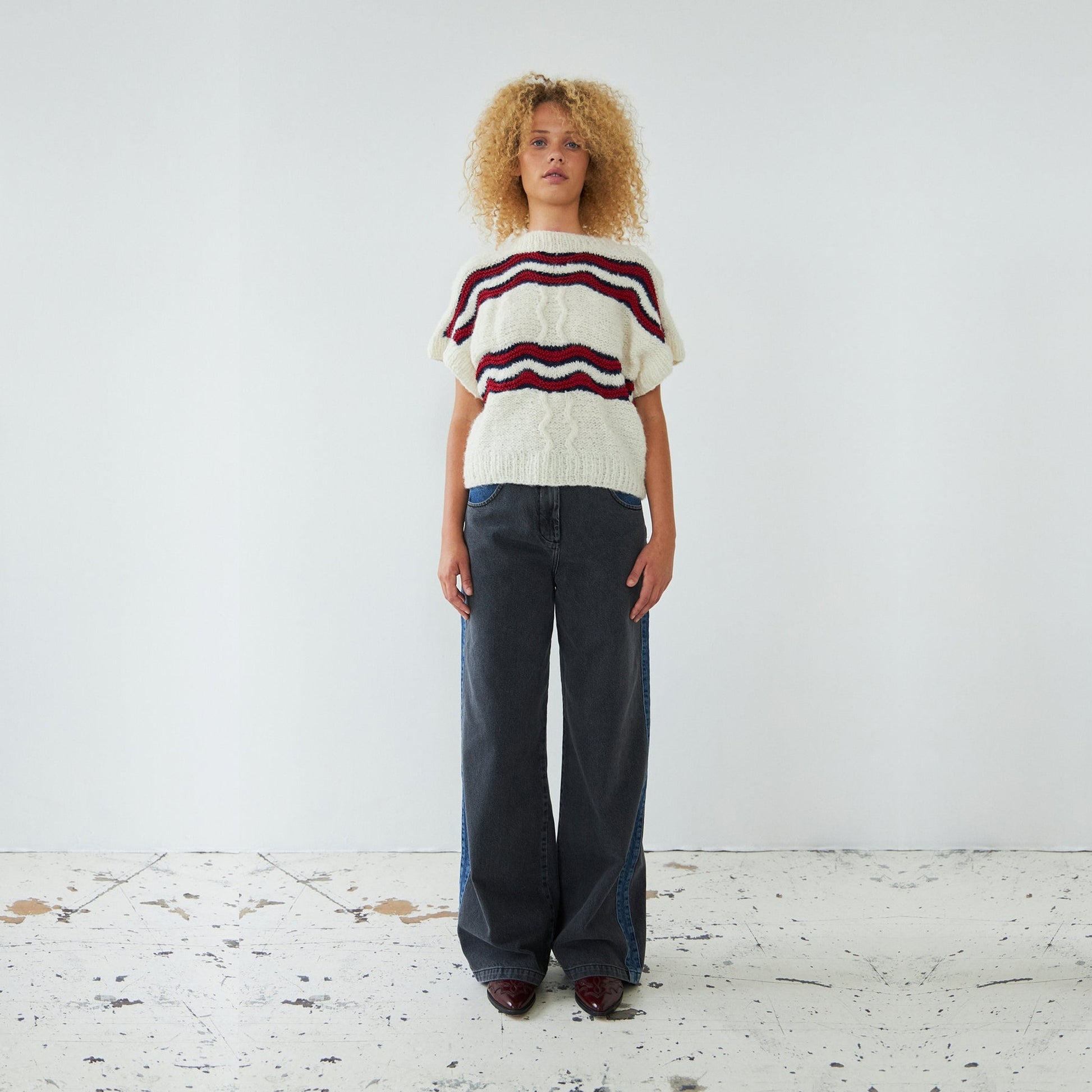 Introducing Stella Nova to Mr & Mrs Stitch. Founded in 2002 by designer and creative director Trine Skoller, Stella Nova's focal point is the creation of the perfect must-have wardrobe where every style consists of little treasures, that each tell their own story. The playful universe of Stella Nova creates unique styles that women will want in their wardrobe now and forever. This knitwear handcrafted vest is crafted from alpaca wool features “waves of colour” across the chest and waist. It also includes a round neckline, batwing sleeves and a jacquard knitted design. Wear this shirt with a pair Ottd’ame trousers and a pair of Veja sneakers.