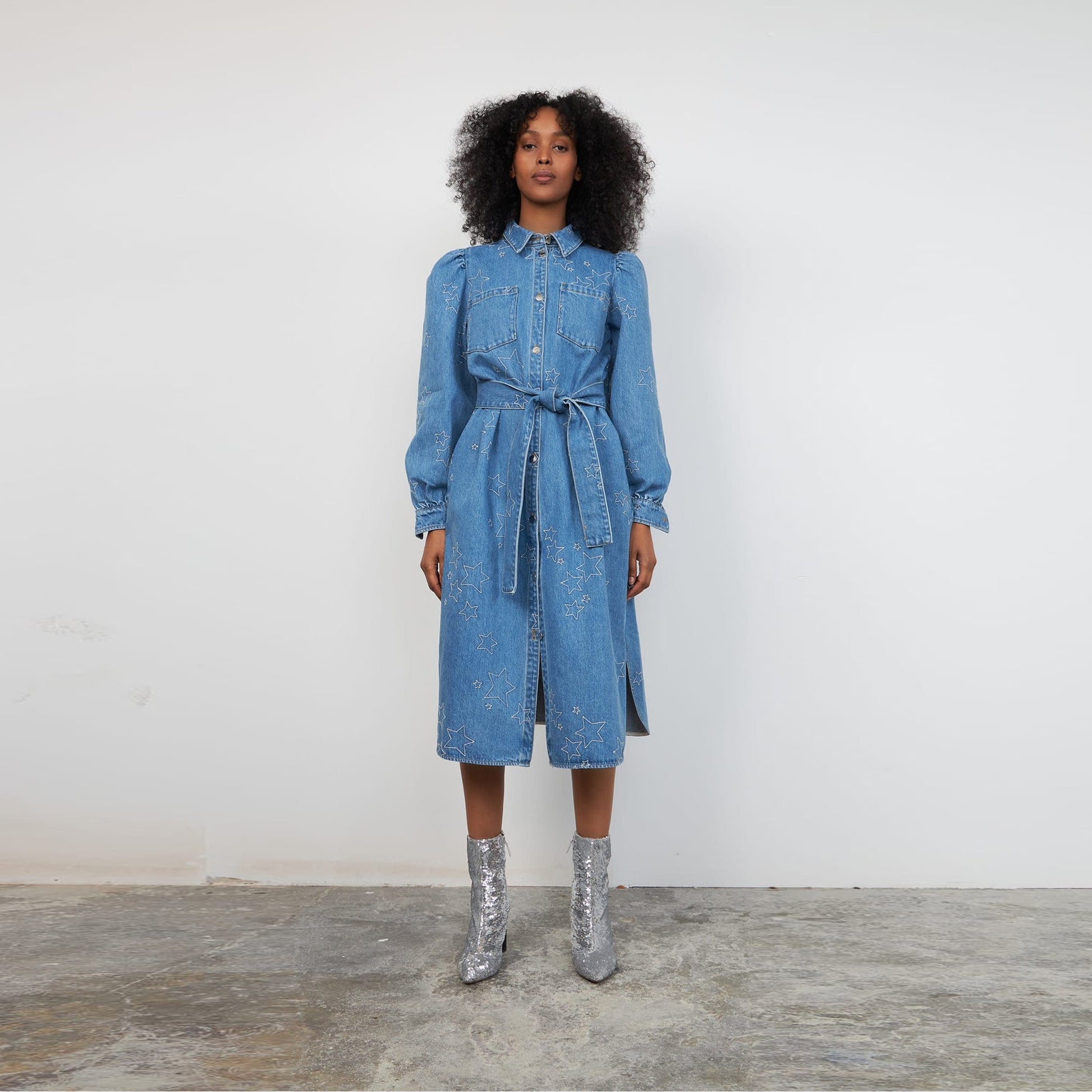 Introducing one of our newest labels, Stella Nova to Mr & Mrs Stitch. Founded in 2002 by designer and creative director Trine Skoller, Stella Nova's focal point is the creation of the perfect must-have wardrobe where every style consists of little treasures, that each tell their own story. The playful universe of Stella Nova creates unique styles that women will want in their wardrobe now and forever. Add a good dose of fun to your wardrobe this season, with this nice denim dress with all over embroidered stars. The dress has a placket with silver buttons, shirt collar, side and breast pockets and pleasts at shoulders creating a light puff effect. The dress comes with a loose tie belt at waist.