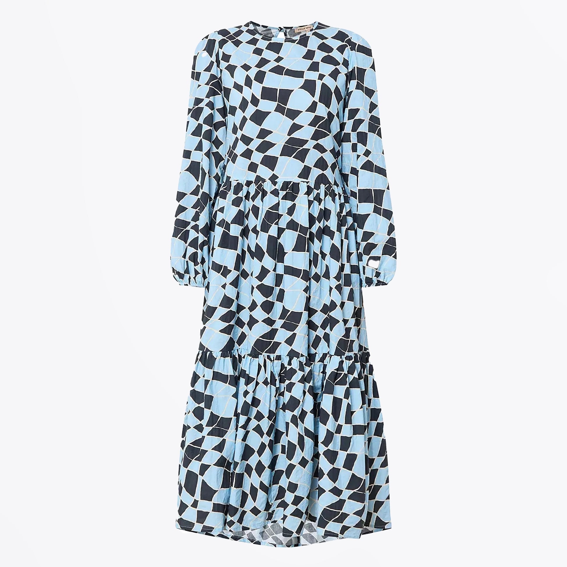 Introducing Stella Nova to Mr & Mrs Stitch. Founded in 2002 by designer and creative director Trine Skoller, Stella Nova's focal point is the creation of the perfect must-have wardrobe where every style consists of little treasures, that each tell their own story. The playful universe of Stella Nova creates unique styles that women will want in their wardrobe now and forever. This mini cotton dress features a warped blue check design, China collar neckline, half button up fastening, single button closed cuffs and long sleeves.