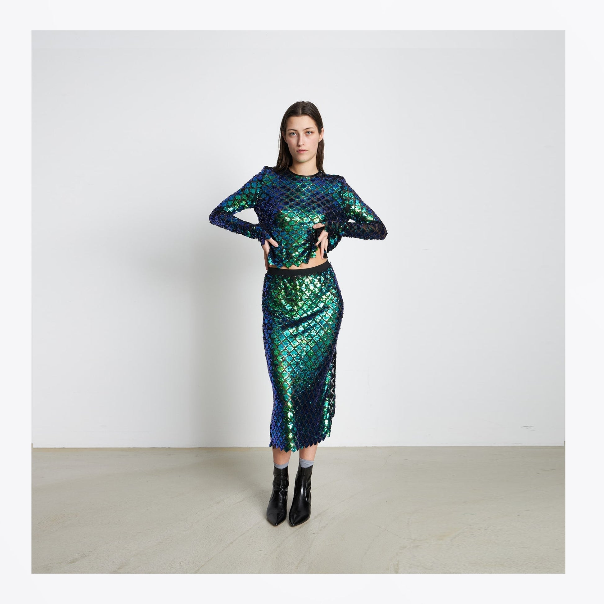 Introducing one of our newest labels, Stella Nova to Mr & Mrs Stitch. Founded in 2002 by designer and creative director Trine Skoller, Stella Nova's focal point is the creation of the perfect must-have wardrobe where every style consists of little treasures, that each tell their own story. The playful universe of Stella Nova creates unique styles that women will want in their wardrobe now and forever. Add a fun top to your wardrobe this season with this piece, featuring a harlequin sequin design, on a black base. This features a long sleeve and a single button closure. Wear this top with matching skirt or make it casual with plain trouser or jeans and channel your inner mermaid.