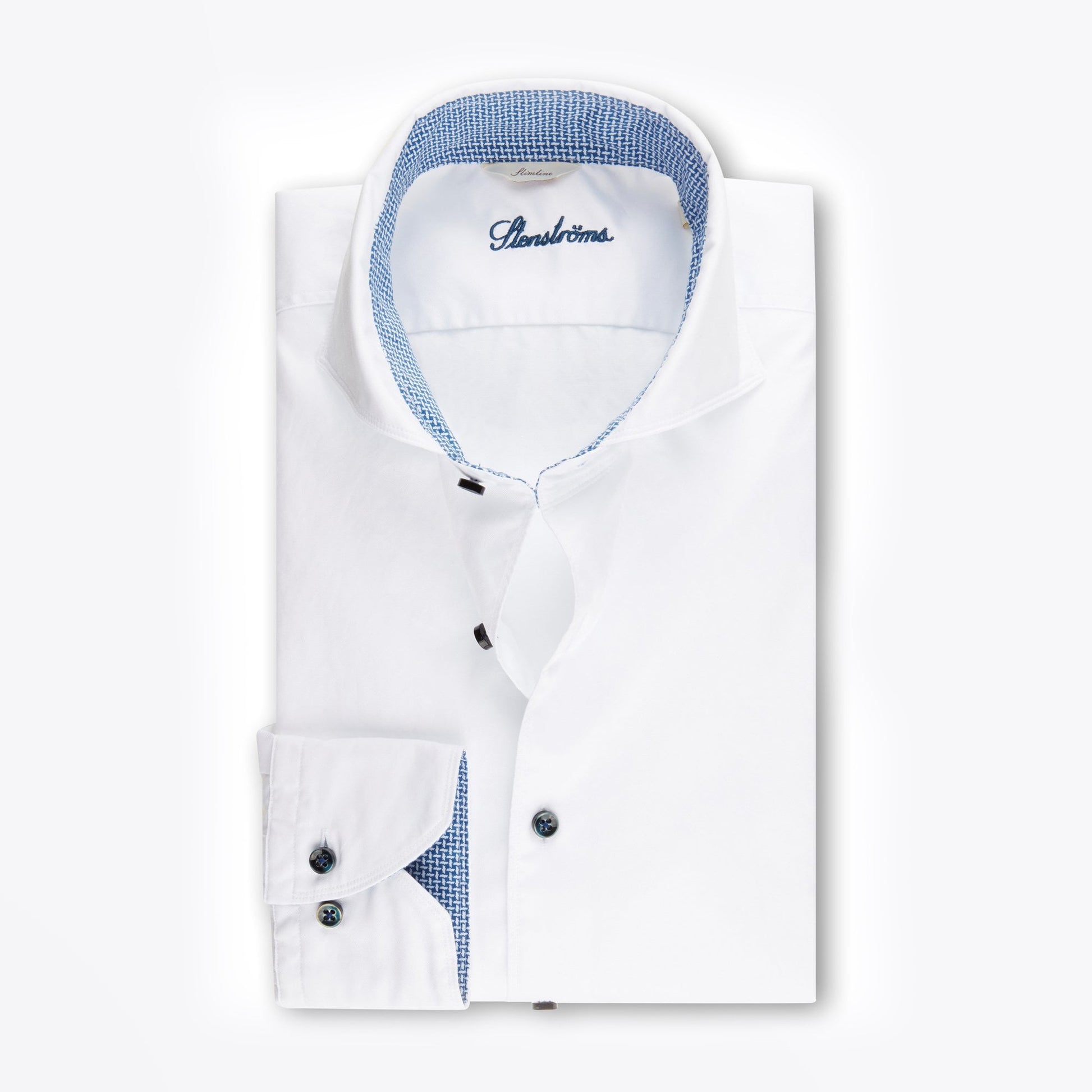 Introducing our new collection of Stenstr��ms shirts to Mr and Mrs Stitch, expertly crafted using premium cotton and silk fabrications. Luxury menswear designer Stenstroms specialise in producing signature professional and evening apparel for the style-savvy gent. This crisp white shirt crafted from a twofold superior twill quality with added stretch making it breathable and comfortable to wear. Features of this stunning structured shirt include a basket print insert on the collar and cuff, cutaway collar, blue sheen buttons and square two buttoned cuff. This shirt will take you from modern business to smart casual and is a must-have this season!