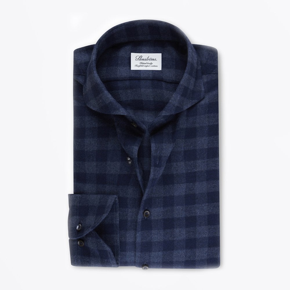 Introducing our new collection of Stenstr��ms shirts to Mr and Mrs Stitch, expertly crafted using premium cotton and silk fabrications. Luxury menswear designer Stenstroms specialise in producing signature professional and evening apparel for the style-savvy gent. This slimline checked flannel shirt in navy is crafted from a premium cotton making it breathable and comfortable to wear. This stunning shirt is detailed with a cut away collar, single cuffs and button-down front. Wear it as it is, tucked into your favourite pair of tailored chinos or jeans.