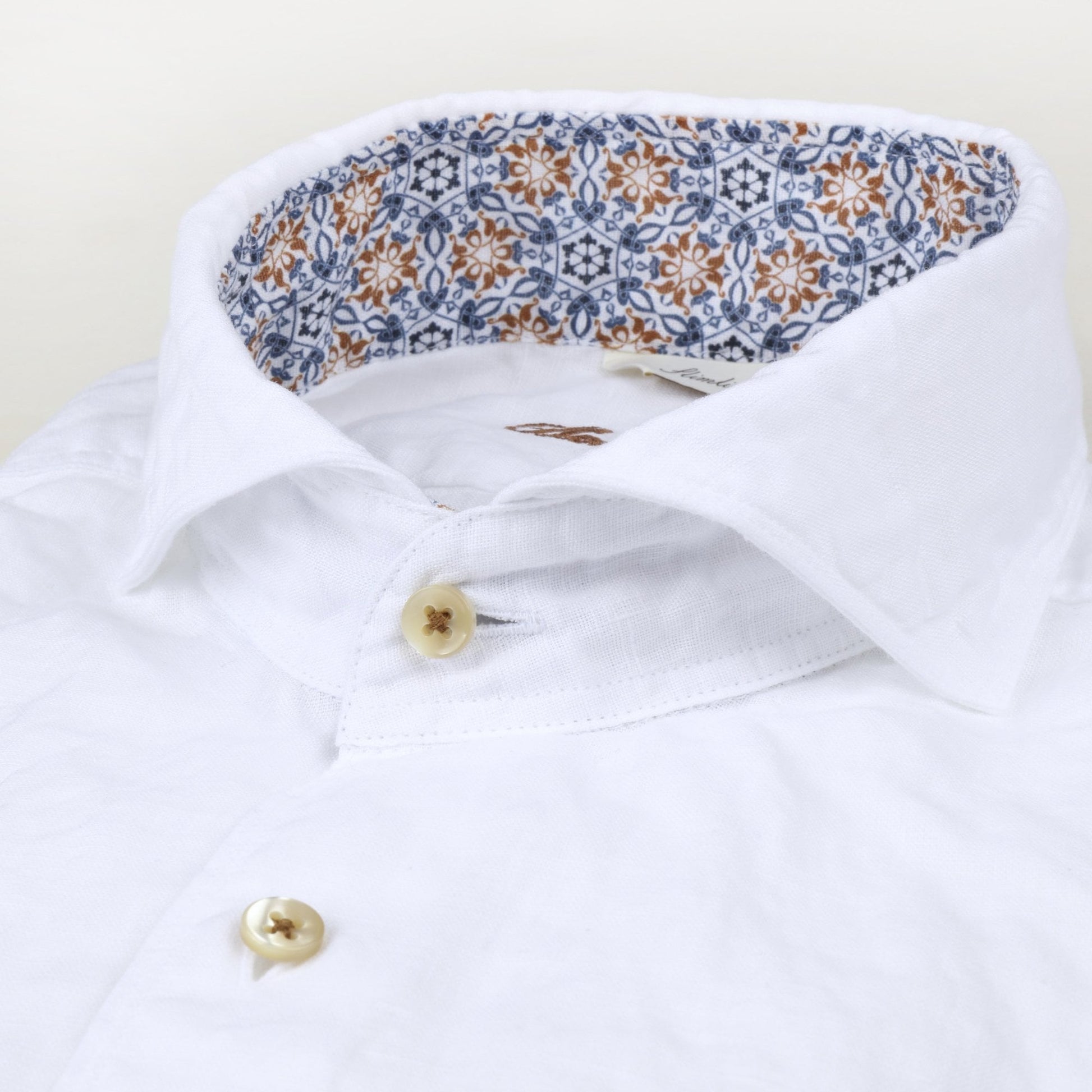 Introducing our new collection of Stenstr��ms shirts to Mr and Mrs Stitch, expertly crafted using premium cotton and silk fabrications. Luxury menswear designer Stenstroms specialise in producing signature professional and evening apparel for the style-savvy gent. This slimline shirt in white is crafted from a superior lightweight linen making it breathable and comfortable to wear. The shirt is detailed with a patterned contrast fabric inside collar and cuffs. Added features of this stunning structured shirt include a cut-away collar, single adjustable cuffs and beige mother of pearl buttons. Team this shirt under a knitted sweater or tucked into your favourite pair of tailored trousers.