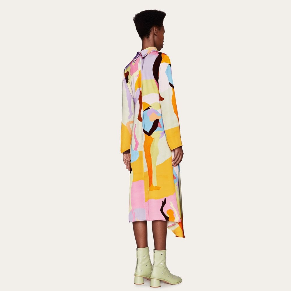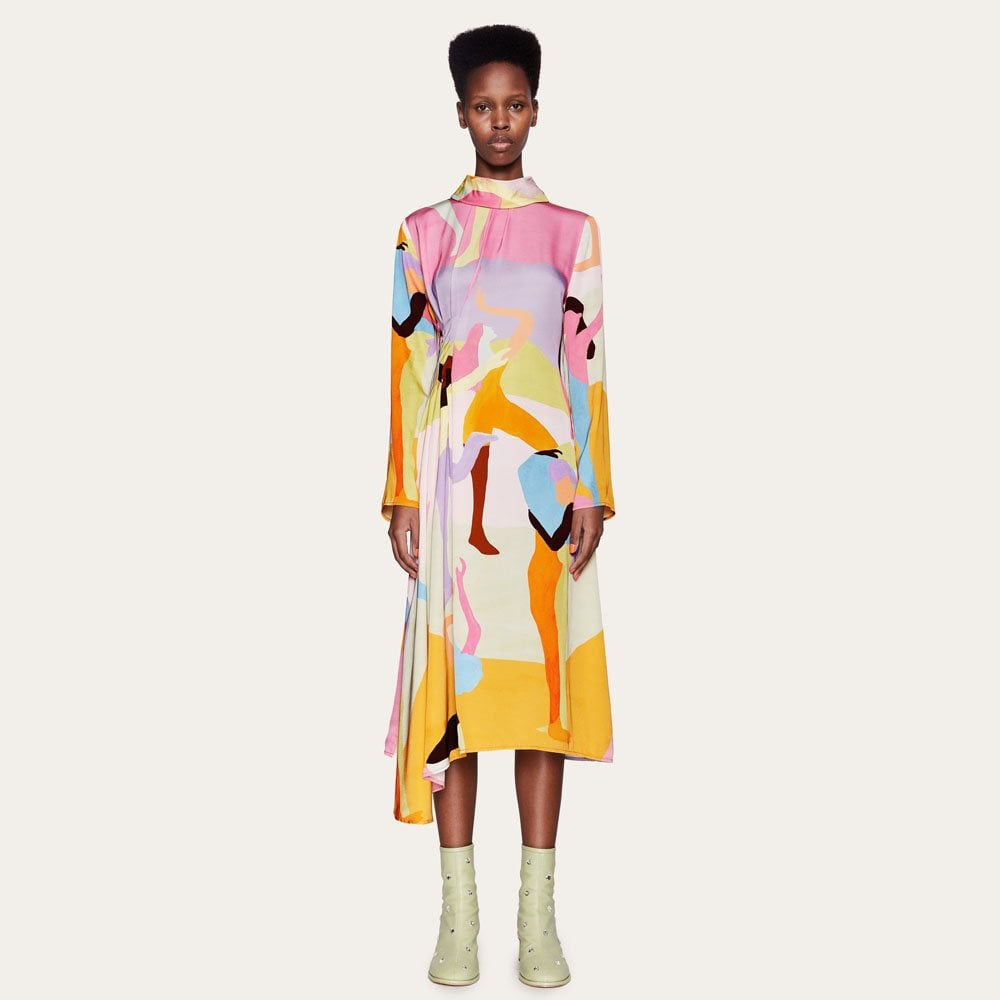 Arlinda Dress with Dance print. Made from a fluid viscose fabric for a slim fit with a pleated bodice and a draped A-line skirt with asymmetric hem. Designed with a fold-over collar and long sleeves. Button and concealed zip fastening along back.