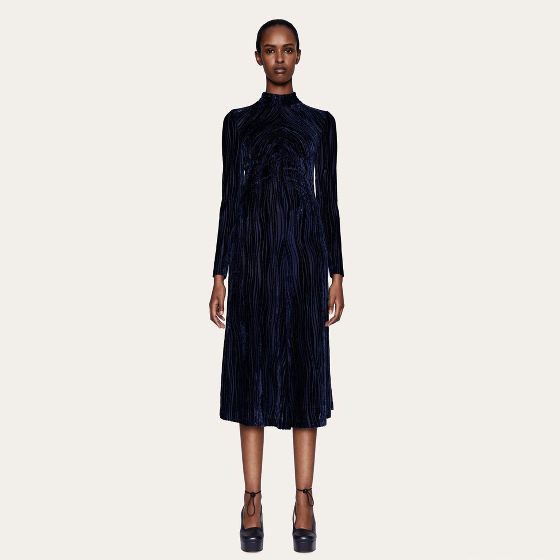 The Asher dress in Wave midnight is designed in an A-line silhouette. This stylish tight-fitted dress features a stand collar, long slim sleeves and is characterised by its draping details at the chest and upper back. This classic Stine Goya silhouette is created in an all-over wavy fabric texture that is created using velvet devor�� in a deep navy colour with sparkling details. This dress is cut below the knee and has an invisible zipper on the back.