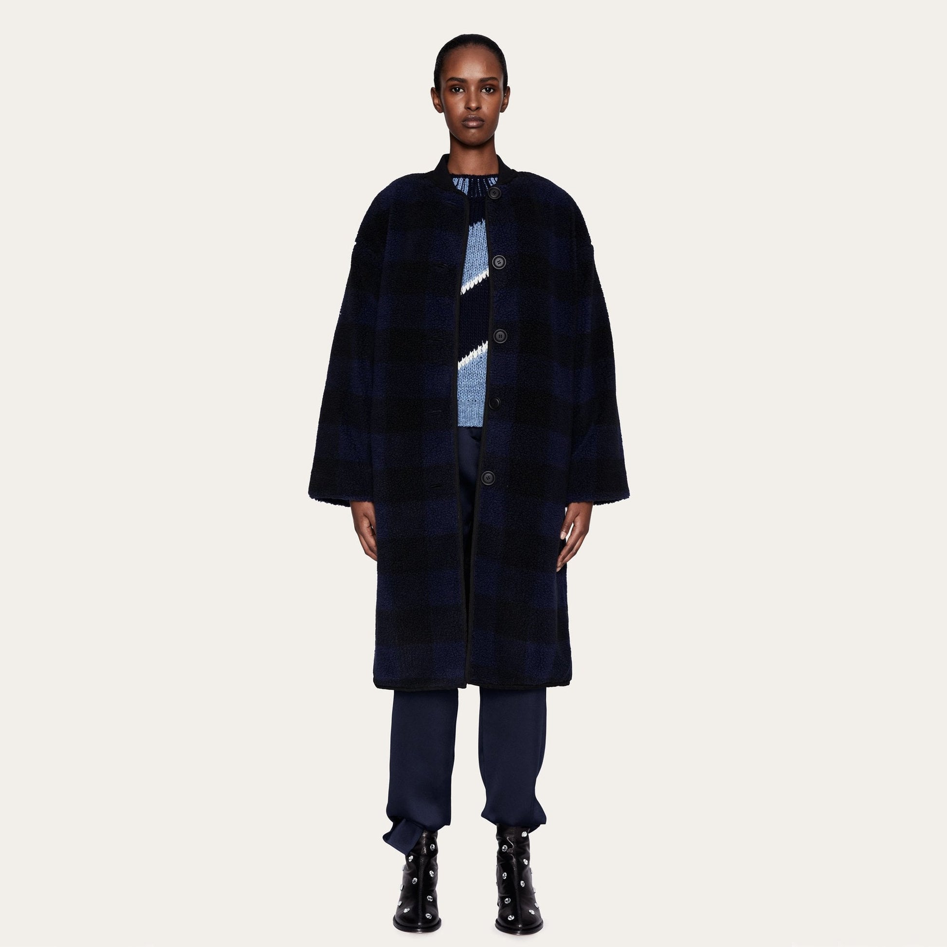 The Beth Fleece Coat in black and blue gingham pattern. This stylish coat features dropped shoulders with long sleeves, pockets and buttons at the front.  Crafted from a recycled fabric in an oversize fit, this coat is fully lined. Complete the look with the Adonis sweater for a warm and cosy look.