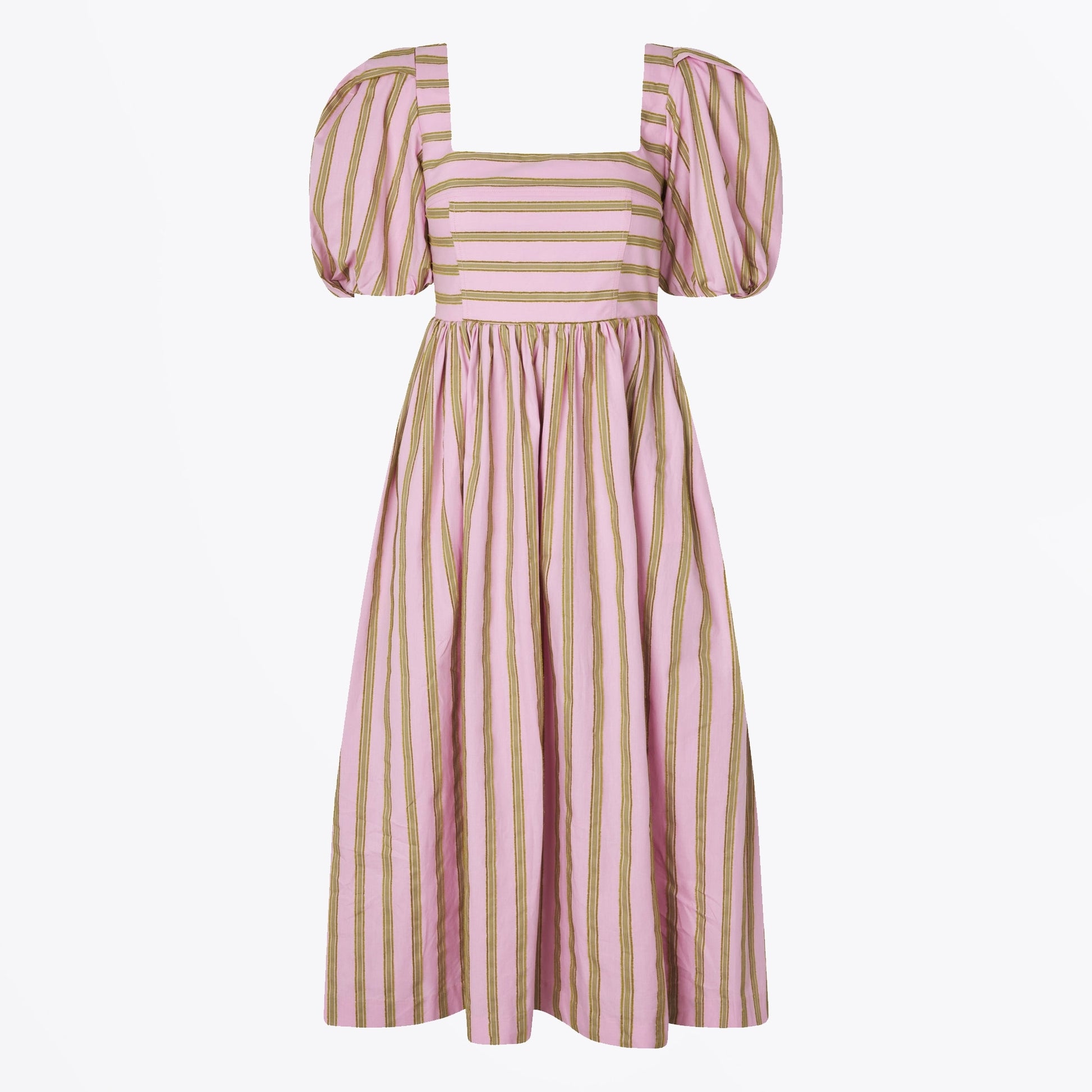 Danish designer Stine Goya launched her eponymous label in 2006 with a rich exploration of colour and print. Drawing on inspiration from the design and art worlds, each collection is built on a strong foundation of flattering cuts, simple yet quality fabrics and bespoke hand-drawn prints by the brands in-house team. Add some fun to your wardrobe with this Stine Goya option. This playful striped midi dress features short puffed sleeves, a square neckline, and hidden side pockets for a touch of practicality. Its charming design adds a fun, feminine flair to any casual or dressy occasion.