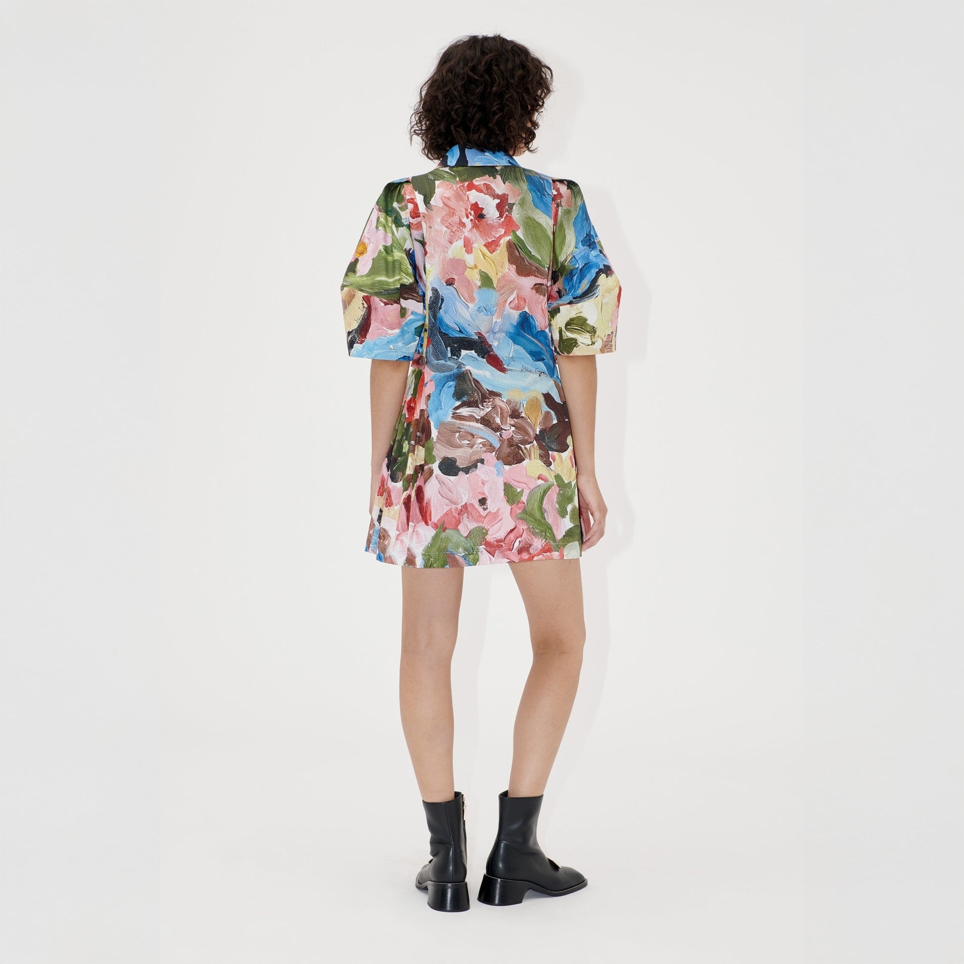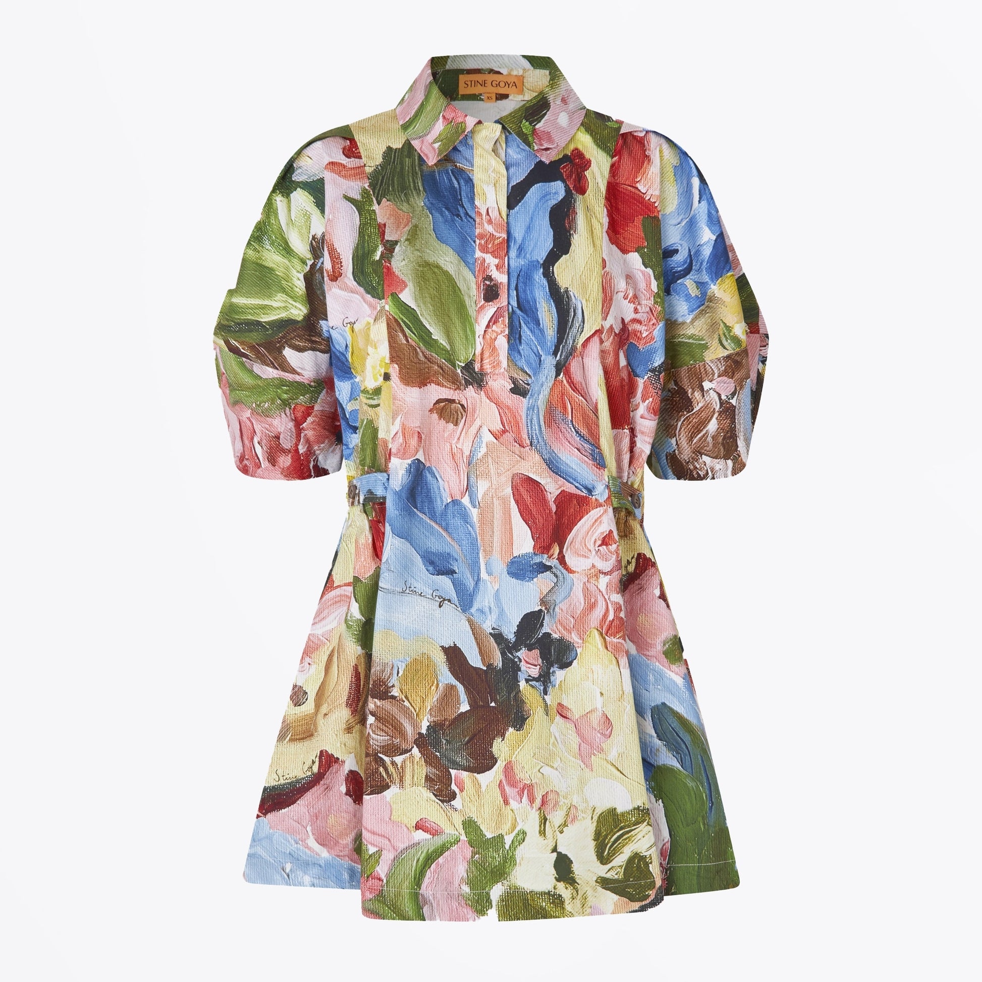 Danish designer Stine Goya launched her eponymous label in 2006 with a rich exploration of colour and print. Drawing on inspiration from the design and art worlds, each collection is built on a strong foundation of flattering cuts, simple yet quality fabrics and bespoke hand-drawn prints by the brands in-house team. Add some fun colour to your wardrobe with this Stine Goya option. This fun shirt dress features a mini A-line skirt with puffed short sleeves and 1/4 button front Wear this dress for any summer event.