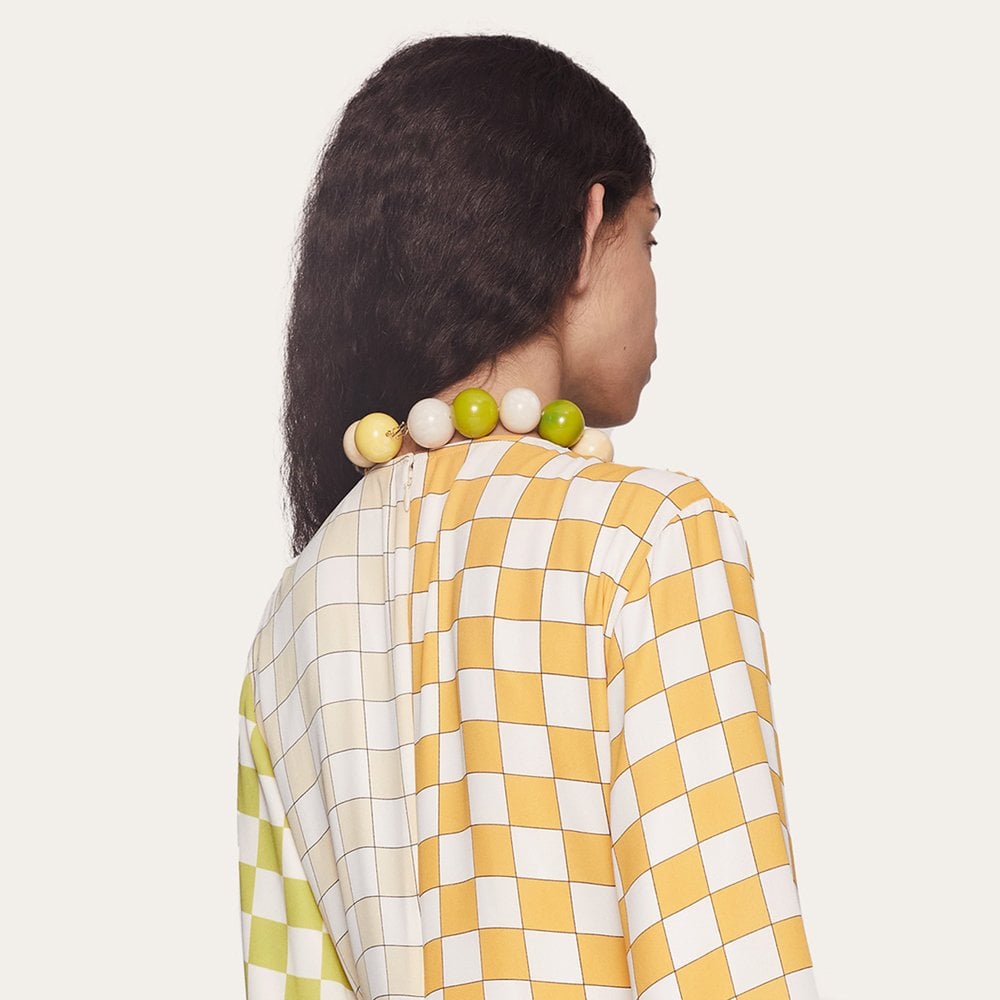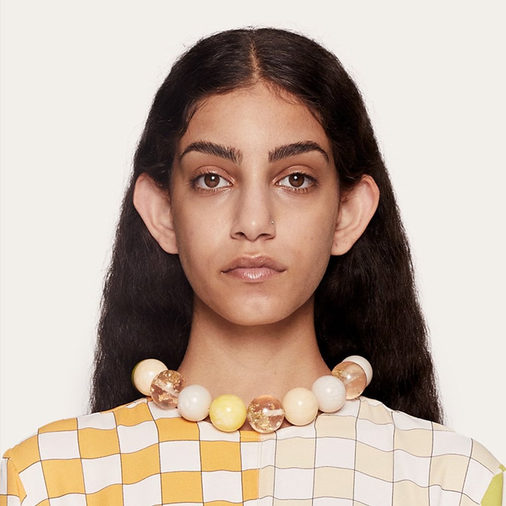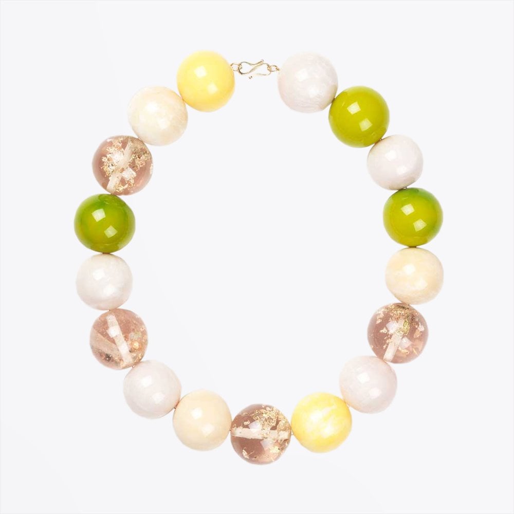Dorty Necklace in Lime. Short beaded necklace with oversized acetate pearls in golden hues and lime green.