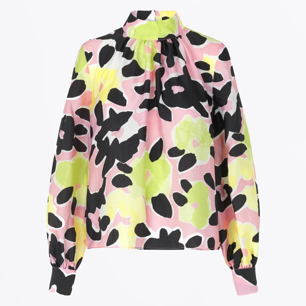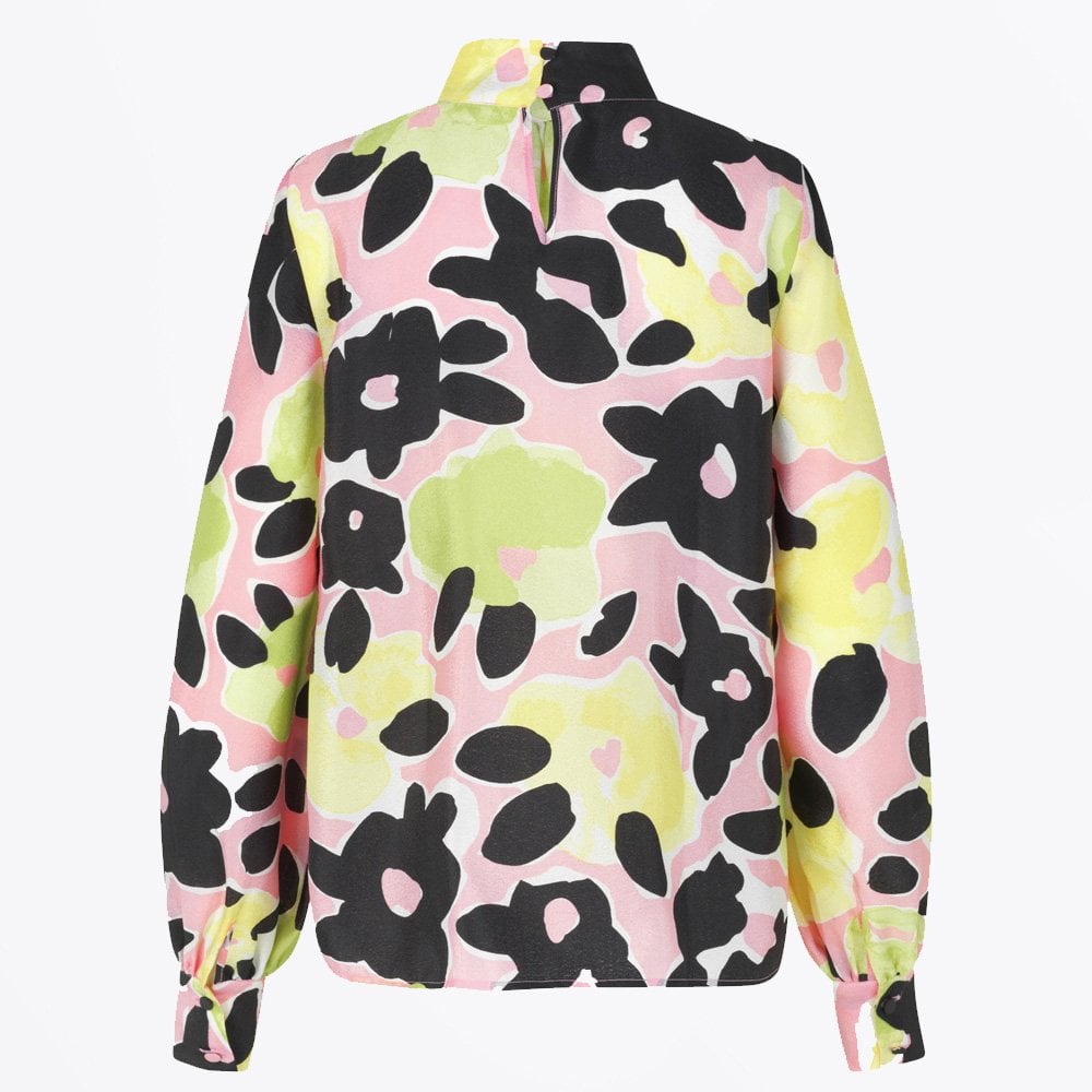 Eddy Blouse in Watercolour Flora. Cut for slightly flared silhouette with long voluminous sleeves with buttoned cuffs, a stand collar and a slim loop closure at back. All-over floral print.