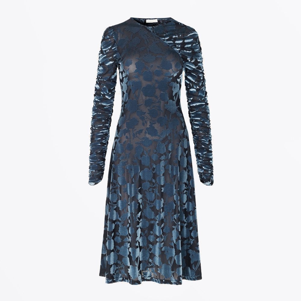 Danish designer Stine Goya launched her eponymous label in 2006 with a rich exploration of colour and print. Drawing on inspiration from the design and art worlds, each collection is built on a strong foundation of flattering cuts, simple yet quality fabrics and bespoke hand-drawn prints by the brands in-house team. Stine Goya's Ellie Dress with all-over floral foliage print on a dark blue background. This A-line dress is designed for a slim fit and features   ruched long sleeves and wrap effect and is detailed with velvety semi-transparent lace pattern.