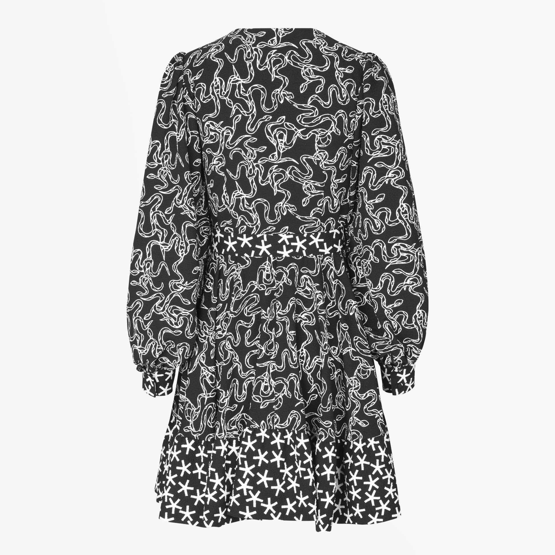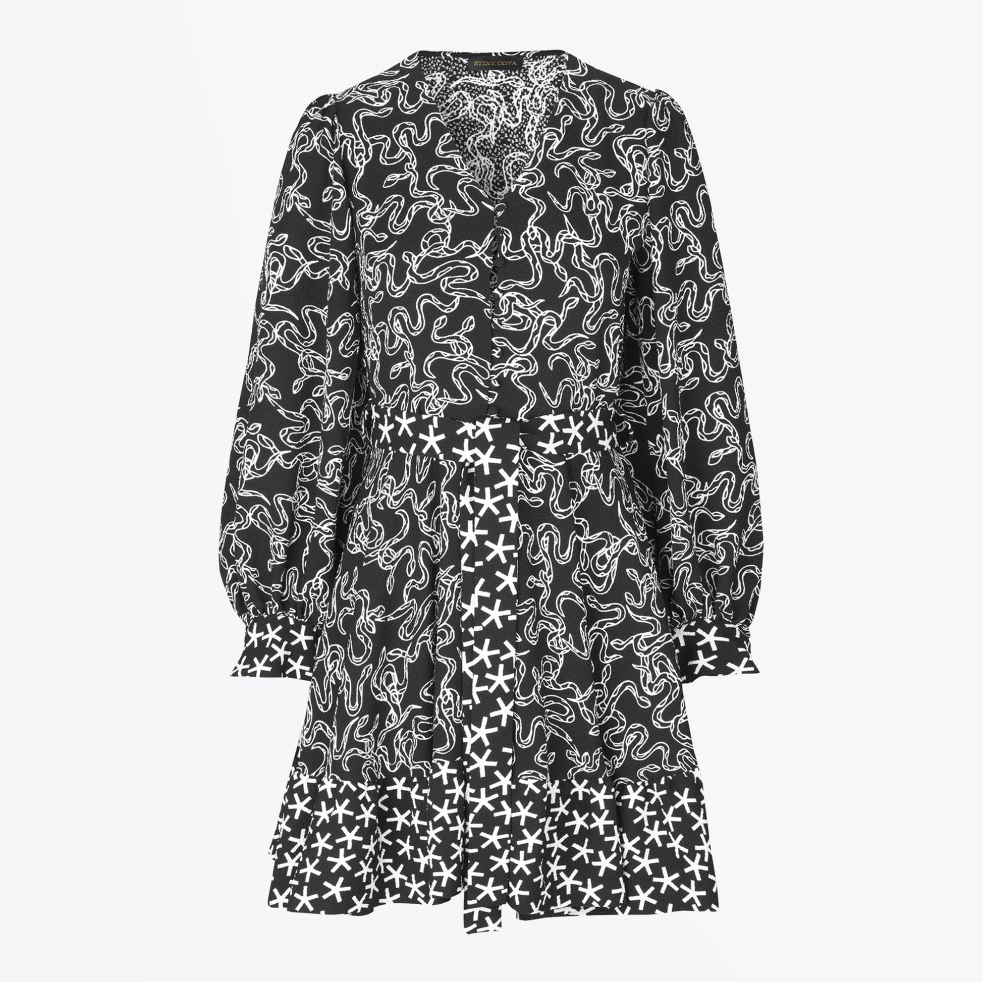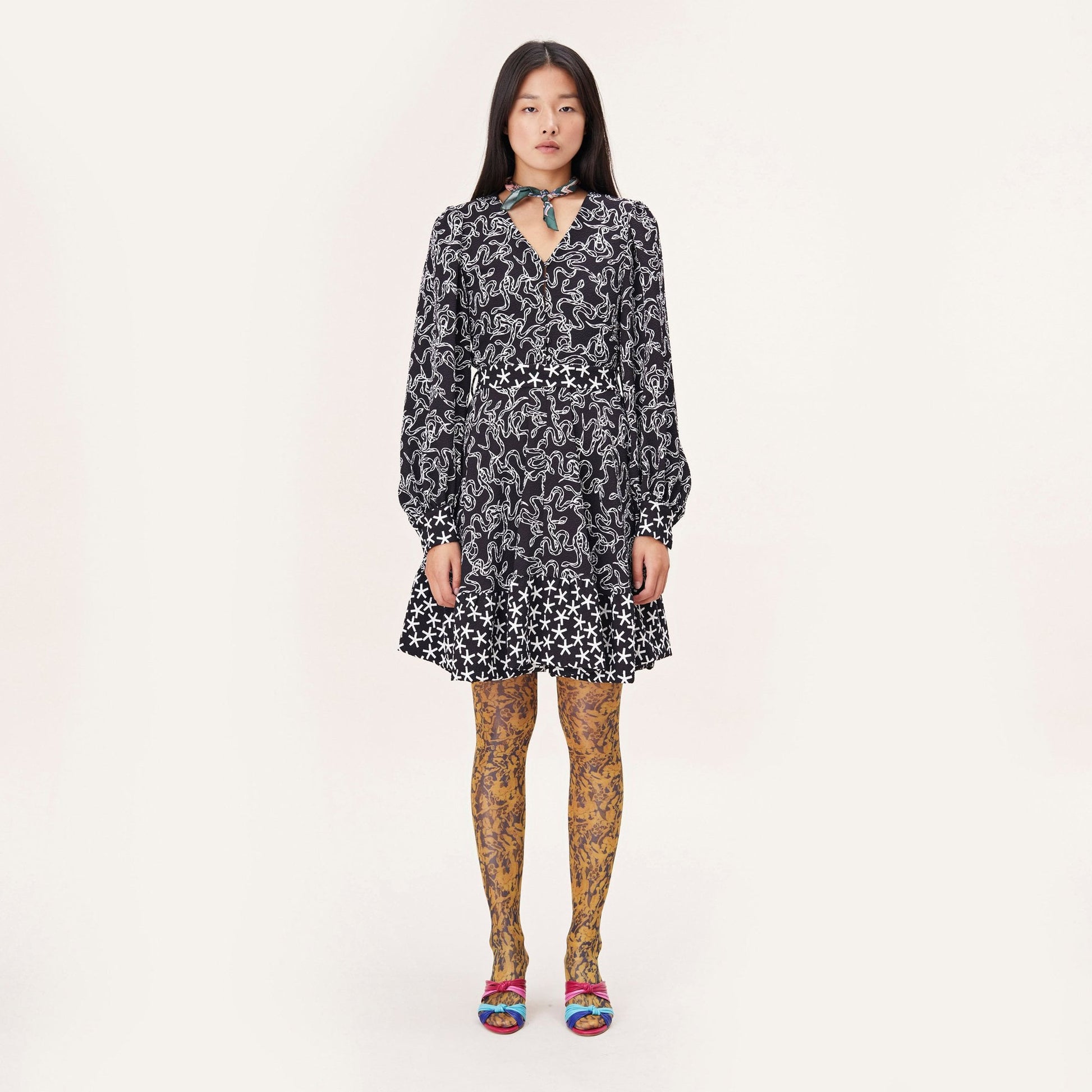 The Farrow Short Structured Dress is designed with a feminine silhouette. This stylish dress features long voluminous sleeves with buttoned cuffs. This structured style is crafted in a stretchy fabric and a playful snake and star print. This flowy skirt cut at mid-thigh length features a ruffled bottom hem, slightly fitted was it with a tie-belt, a button-down front with small loop closures and deep v-neck on the front.
