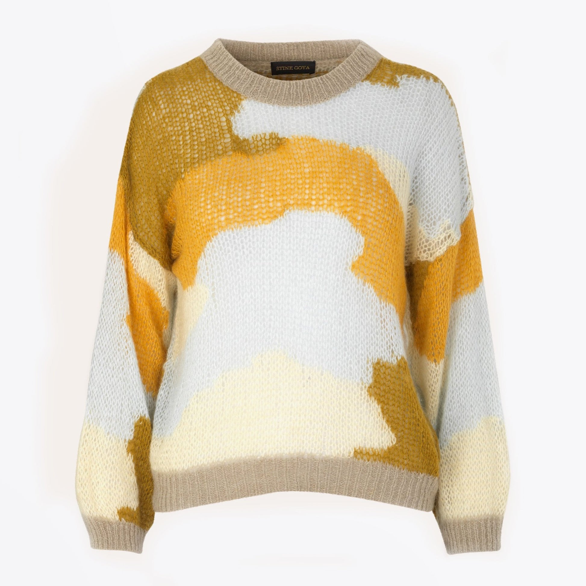 Sana Knit in Camouflage. The Sana knit is an oversized sweater and features a round neckline and dropped shoulders. Crafted from a fine mohair blend this sweater features ribbed knit-work at cuffs, bottom hem and neckline.