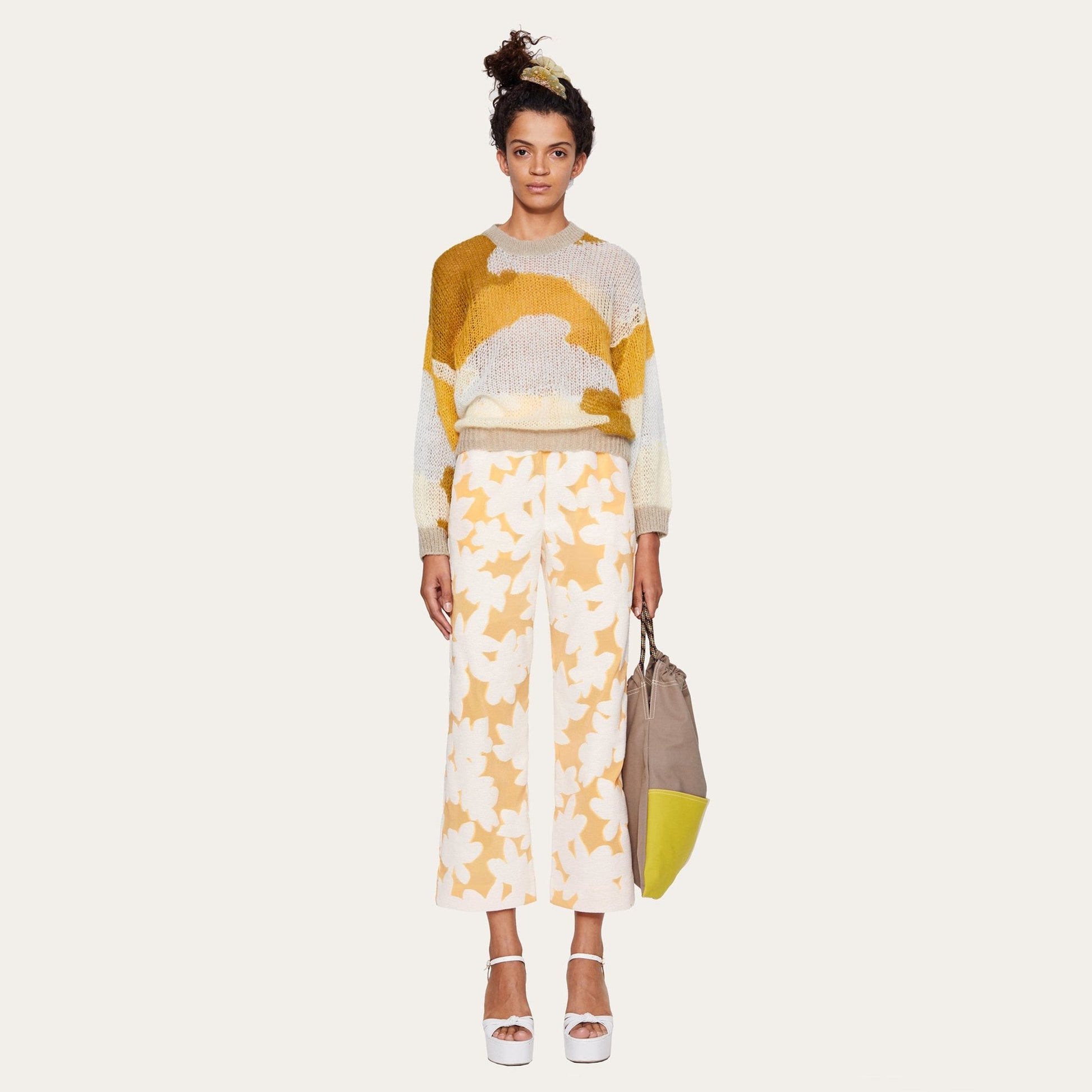 The Camouflage Khaki print is inspired by the wall-to-wall art in Moki Cherry’s home as it features layered skies in an all-over design, turning into a camouflage pattern. The print mixes hues of yellow, khaki and light blue for a classic camouflage look with a Goya twist.