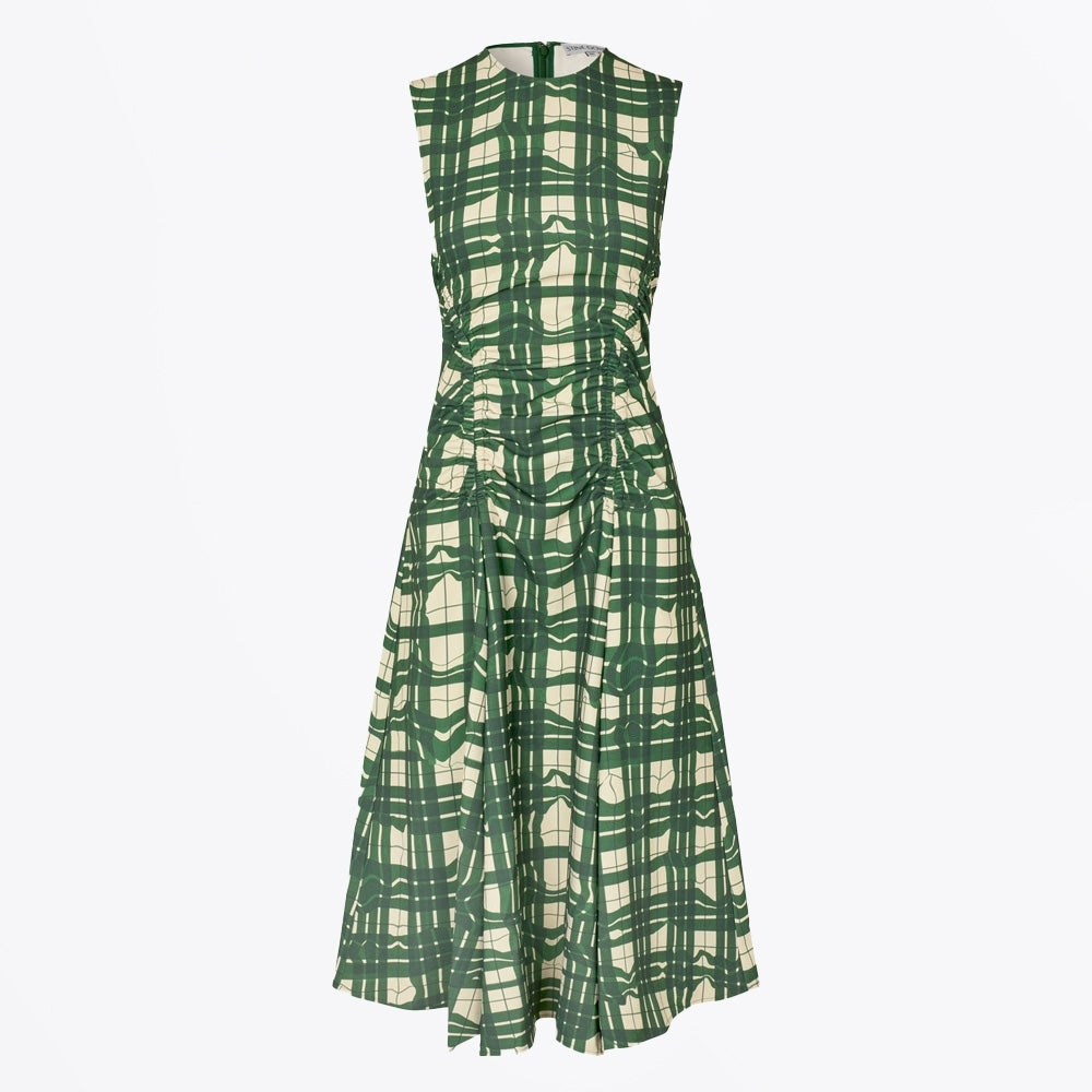 Danish designer Stine Goya launched her eponymous label in 2006 with a rich exploration of colour and print. Drawing on inspiration from the design and art worlds, each collection is built on a strong foundation of flattering cuts, simple yet quality fabrics and bespoke hand-drawn prints by the brands in-house team. Add some fun colour to your wardrobe with this Stine Goya option. The Stine Goya Sleeveless Gathered Midi Dress - Checkered Wave captures casual elegance in a vibrant check pattern of green and off-white. Designed with flattering elasticated side panels and a softly gathered waist, it flows into a flared skirt for graceful movement. A concealed zip at the back ensures a clean silhouette, while its sleeveless cut and midi length make it ideal for layering or wearing solo in warmer weather.