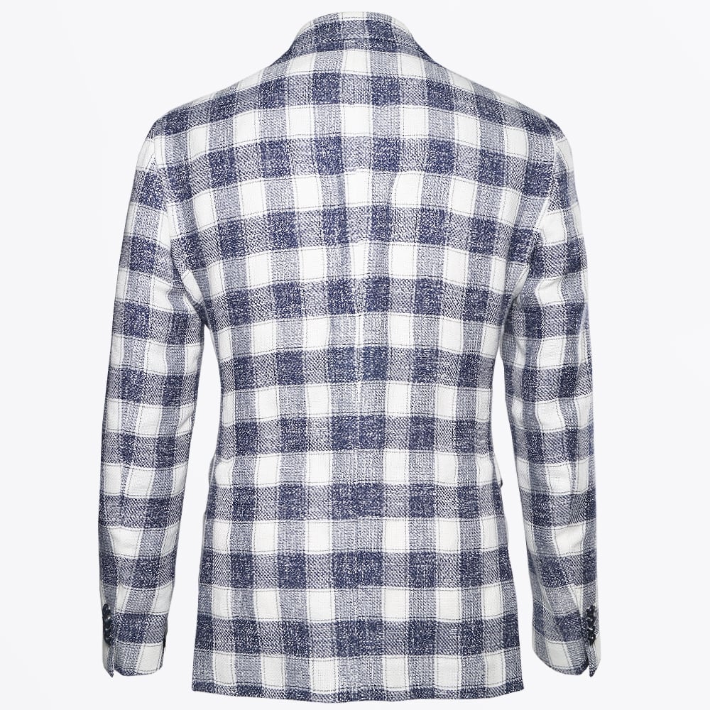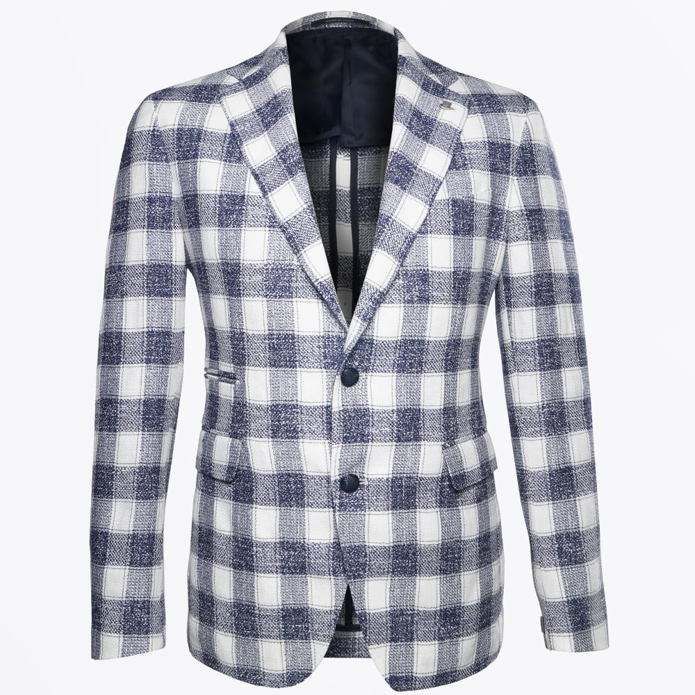 Tagliatore is an Italian brand that stems from family tradition and expert craftsmanship. This handsomely tailored two-button blazer is perfect for business wear or for a special occasion. Made from a textured fabric with a woven navy and white big check pattern, the carved buttons and top hat lapel pin provide a sophisticated touch.