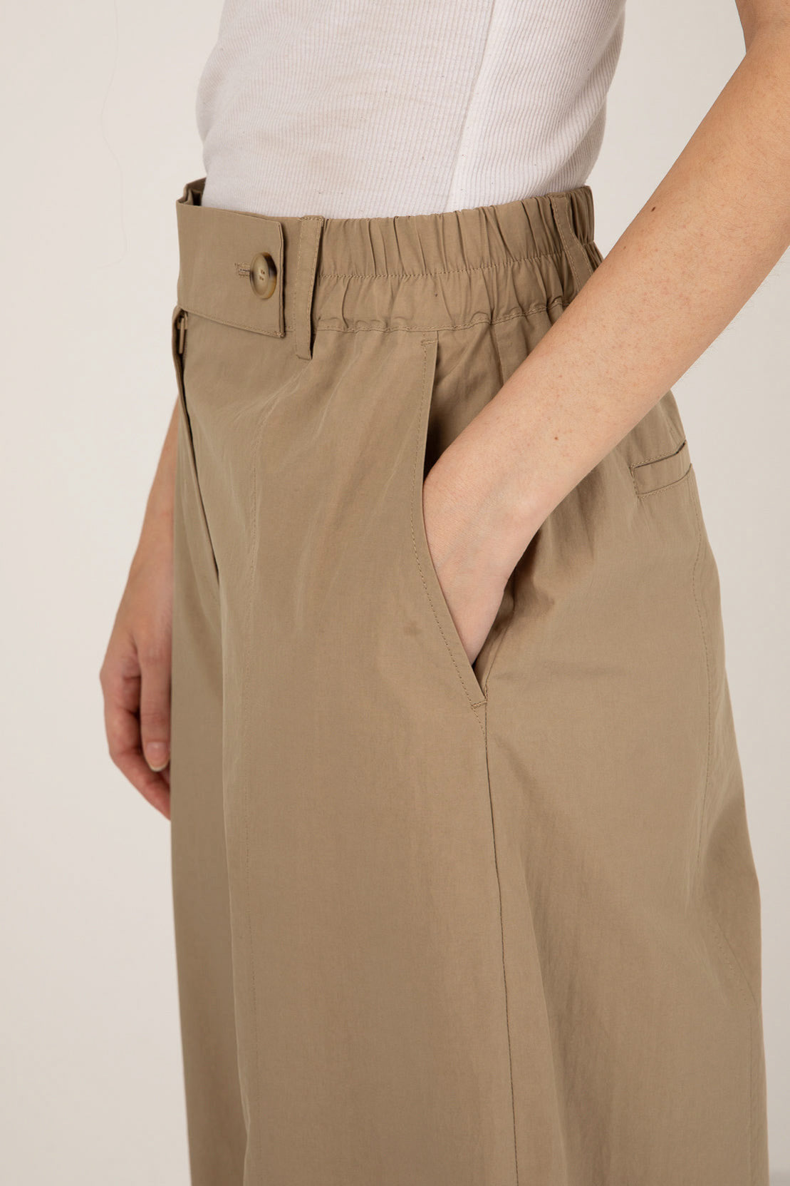 Crafted from 100% cotton, the Thea Barrel Leg Trouser delivers a contemporary silhouette with timeless appeal. The structured waistband features an extended tab closure, while soft front pleats add subtle dimension. A tapered barrel leg crops elegantly at the ankle, paired with clean side-seam pockets for understated functionality. In sandy beige, this piece strikes the perfect balance between refined tailoring and effortless wear. Style with The Martina Poplin Jacket to complete a polished ensemble.