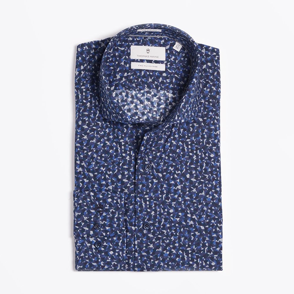 With more than five decades of experience in crafting premium tailored menswear, the Thomas Maine shirt collection offers quality apparel and a sophisticated look that is also affordable. Their distinctive style of effortless sophistication is evident in this navy abstract print shirt crafted in the finest two-ply Italian fabric. Two-ply fabrics are made of double twisted very fine yarns and this technical aspect creates very compact and luxurious fabrics, yet breathable and comfortable to wear. Features of this stunning structured shirt include a cutaway collar, navy buttons, Thomas Maine crest on the cuff and square two buttoned adjustable cuff. This shirt will take you from modern business to smart casual and is a must-have this season!