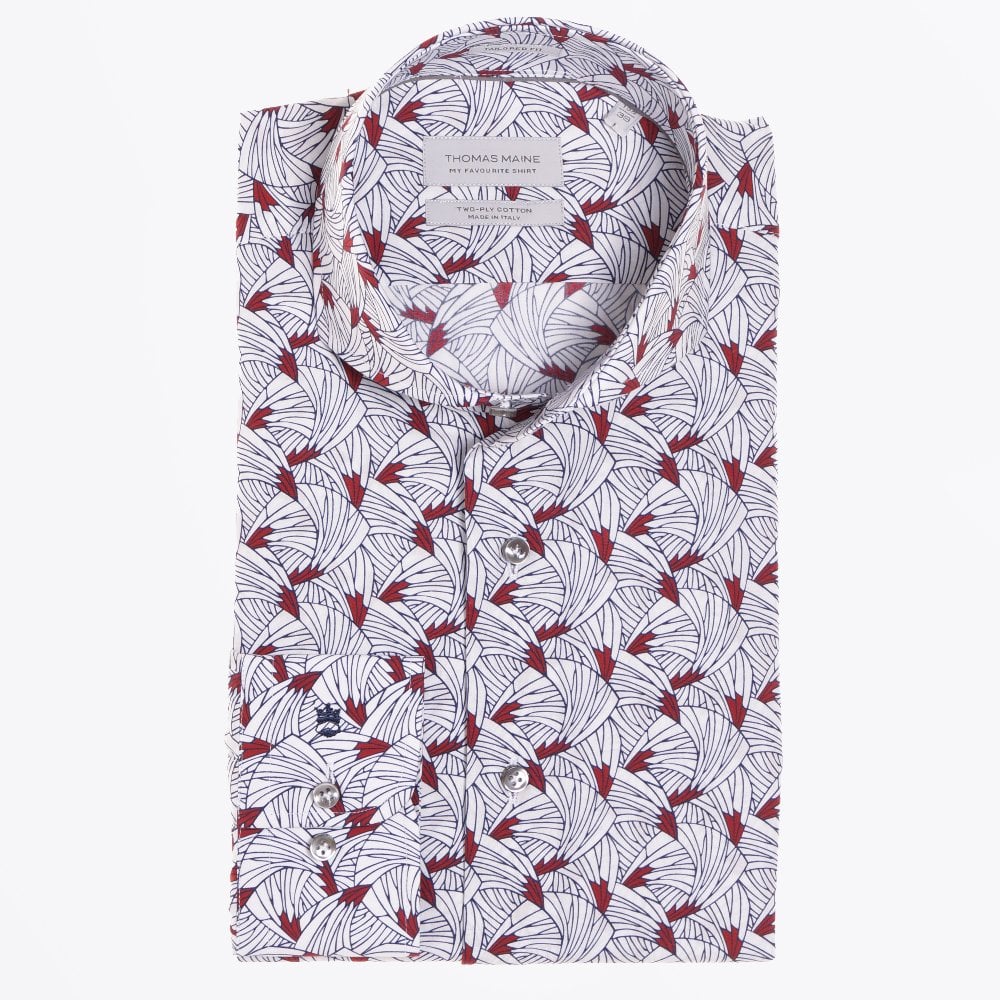 With more than five decades of experience in crafting premium tailored menswear, the Thomas Maine shirt collection offers quality apparel and a sophisticated look that is also affordable. Their distinctive style of effortless sophistication is evident in this abstract print shirt in white with a burgundy detail, which features a cut-away collar, square two buttoned cuff.