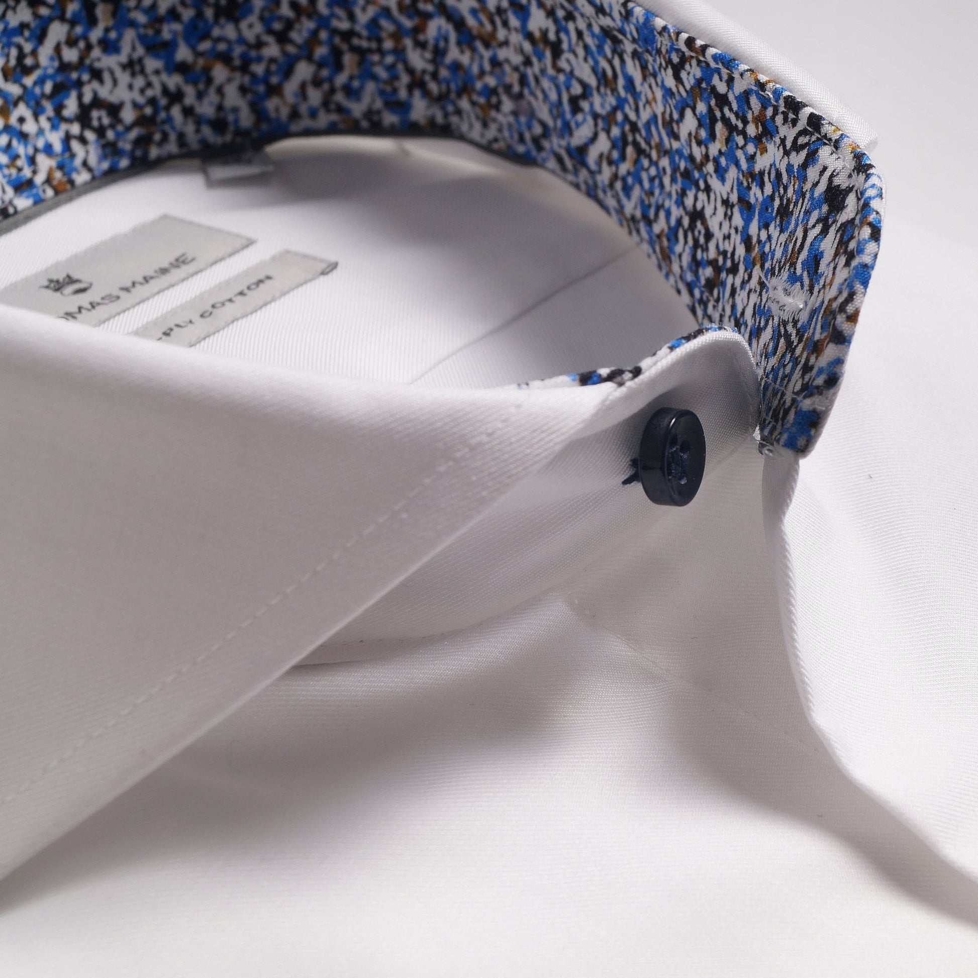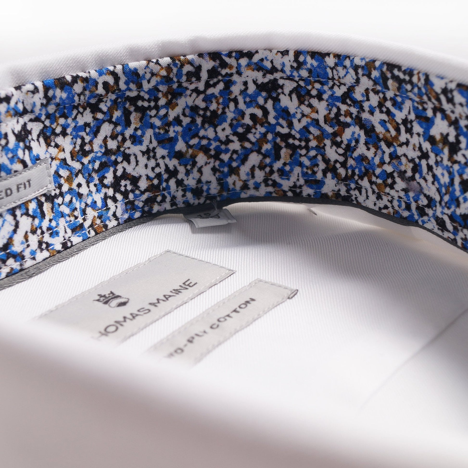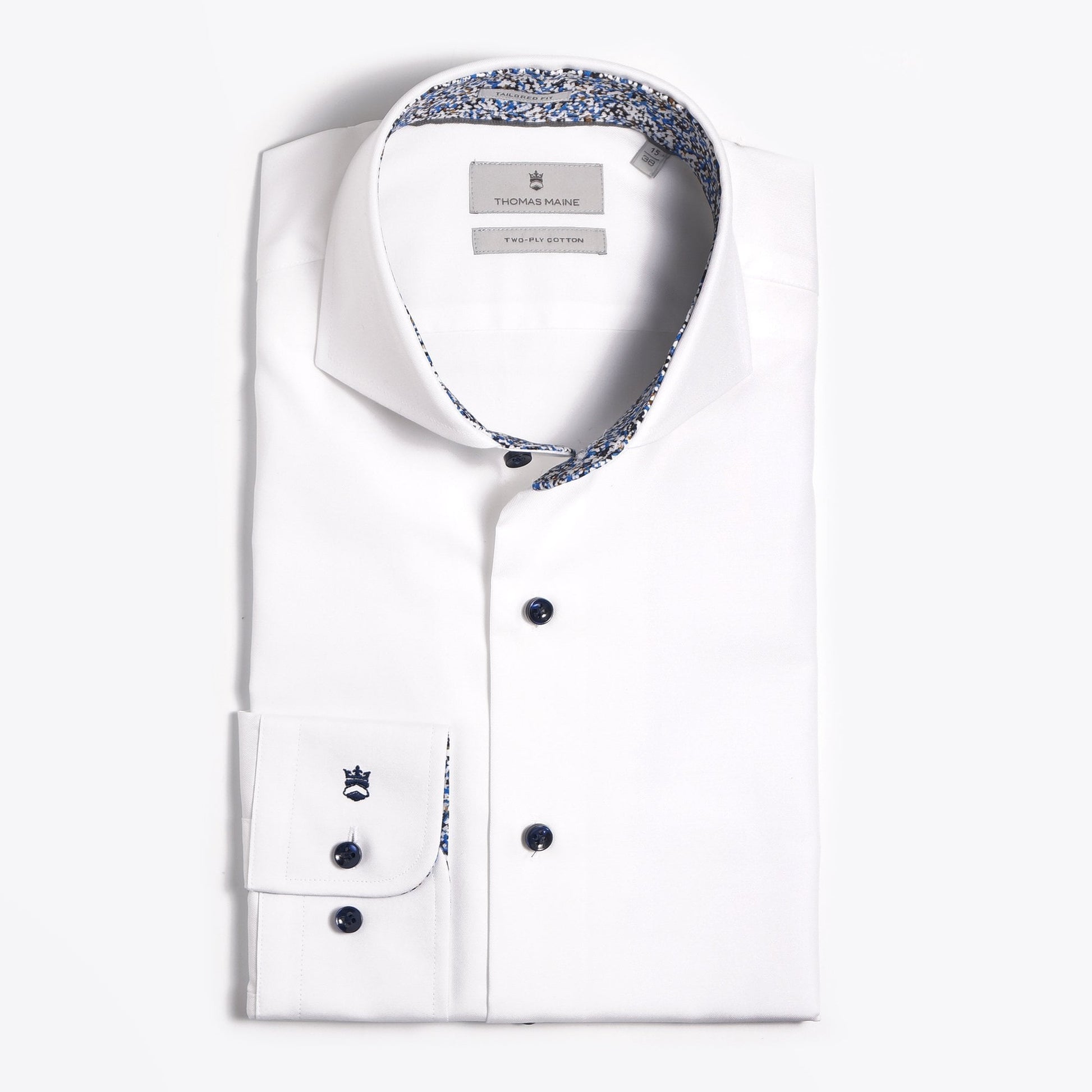 With more than five decades of experience in crafting premium tailored menswear, the Thomas Maine shirt collection offers quality apparel and a sophisticated look that is also affordable. Their distinctive style of effortless sophistication is evident in this crisp white shirt crafted in the finest two-ply Italian fabric. Two-ply fabrics are made of double twisted very fine yarns and this technical aspect creates very compact and luxurious fabrics, yet breathable and comfortable to wear. Crafted in a Albini fabric this shirt will last over time, maintaining its initial characteristics. Features of this stunning structured shirt include an abstract print insert on the collar and cuff, cutaway collar, navy sheen buttons, Thomas Maine crest on the cuff and square two buttoned cuff. This shirt will take you from modern business to smart casual and is a must-have this season!