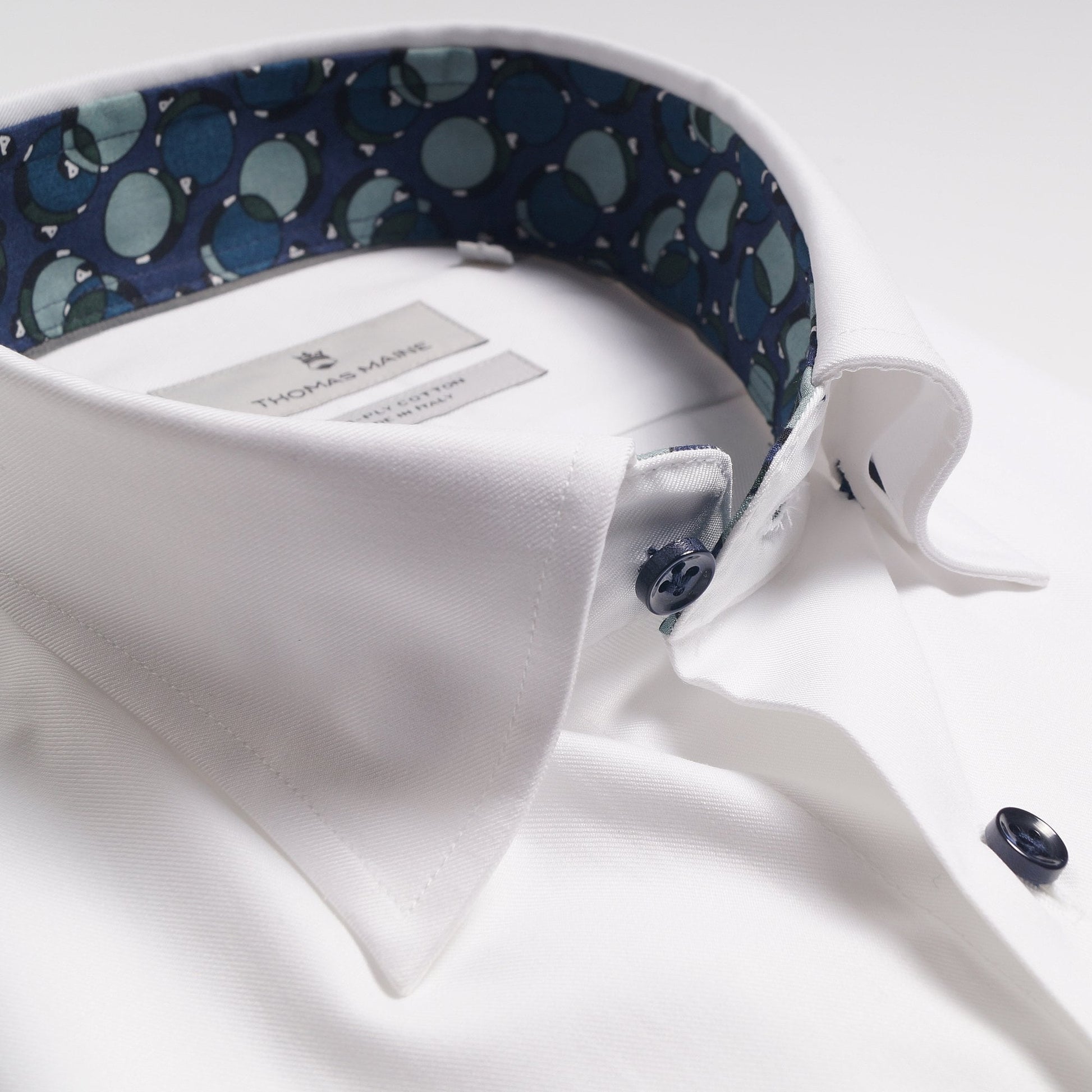 With more than five decades of experience in crafting premium tailored menswear, the Thomas Maine shirt collection offers quality apparel and a sophisticated look that is also affordable. Their distinctive style of effortless sophistication is evident in this crisp white shirt crafted in the finest two-ply Italian fabric. Two-ply fabrics are made of double twisted very fine yarns and this technical aspect creates very compact and luxurious fabrics, yet breathable and comfortable to wear. Crafted in a Albini fabric this shirt will last over time, maintaining its initial characteristics. Features of this stunning structured shirt include a blue circles print insert on the collar and cuff, cutaway collar, navy sheen buttons, Thomas Maine crest on the cuff and square two buttoned adjustable cuff. This shirt will take you from modern business to smart casual and is a must-have this season!