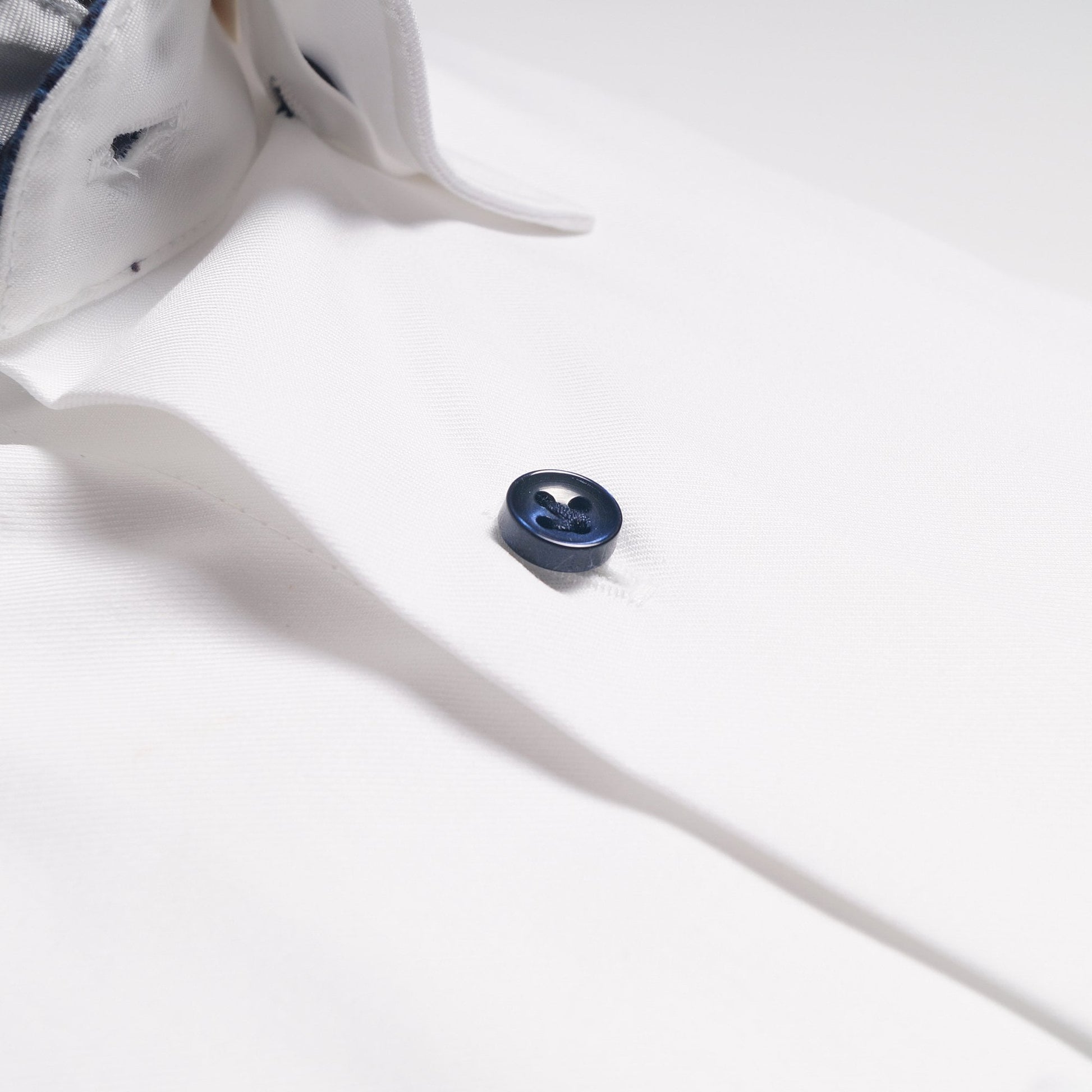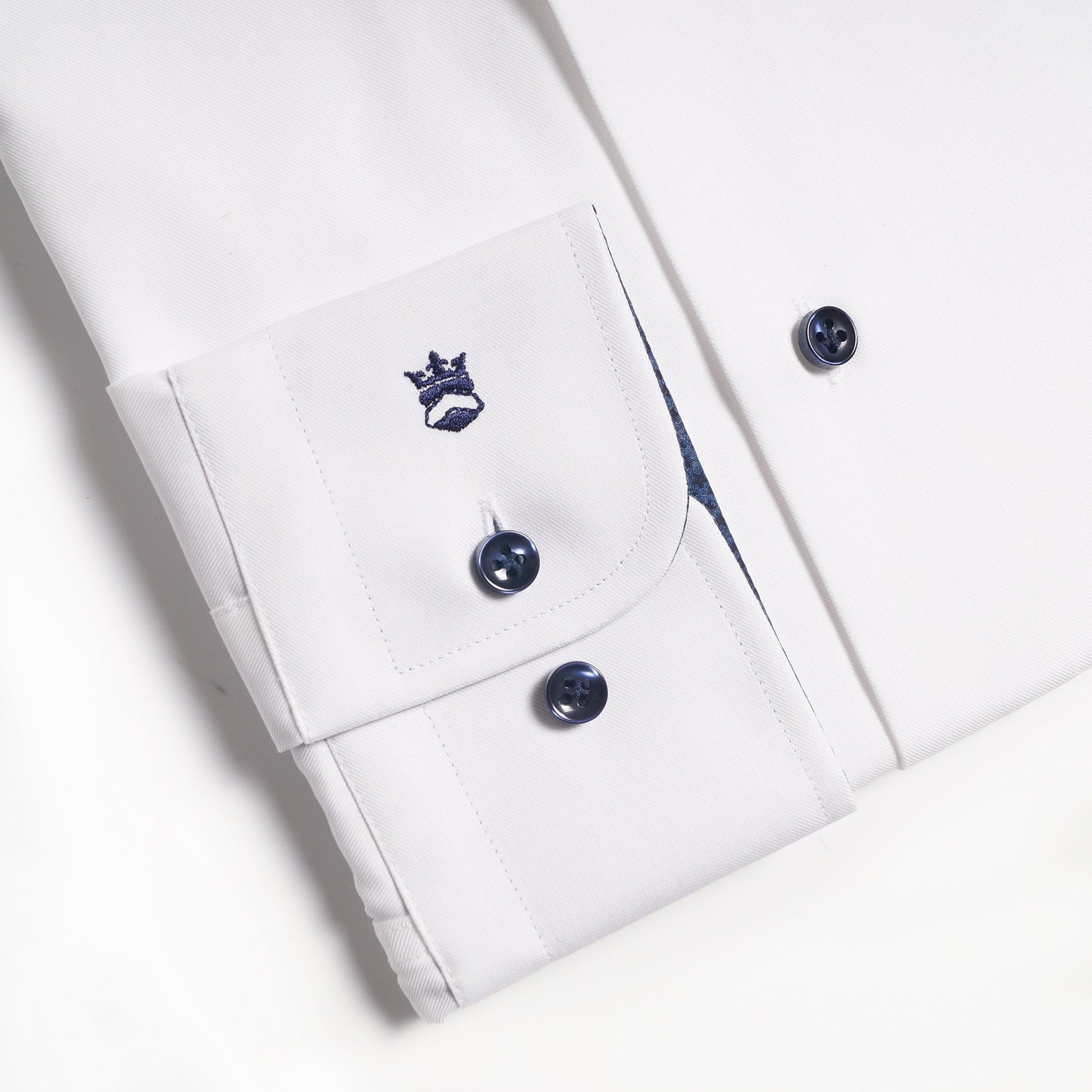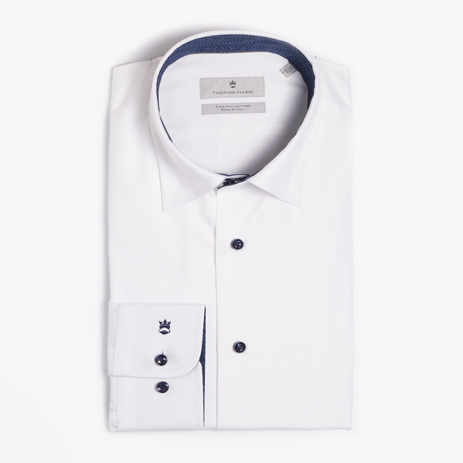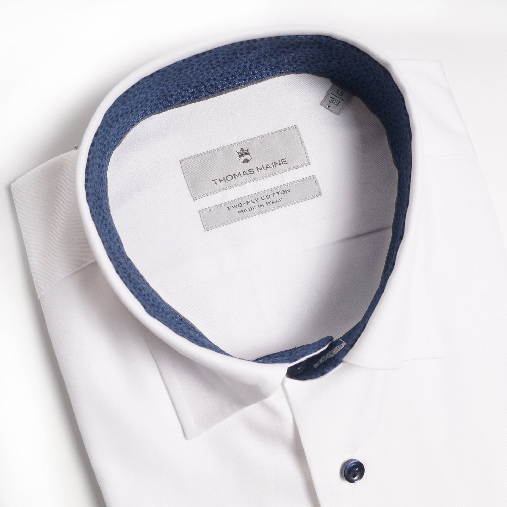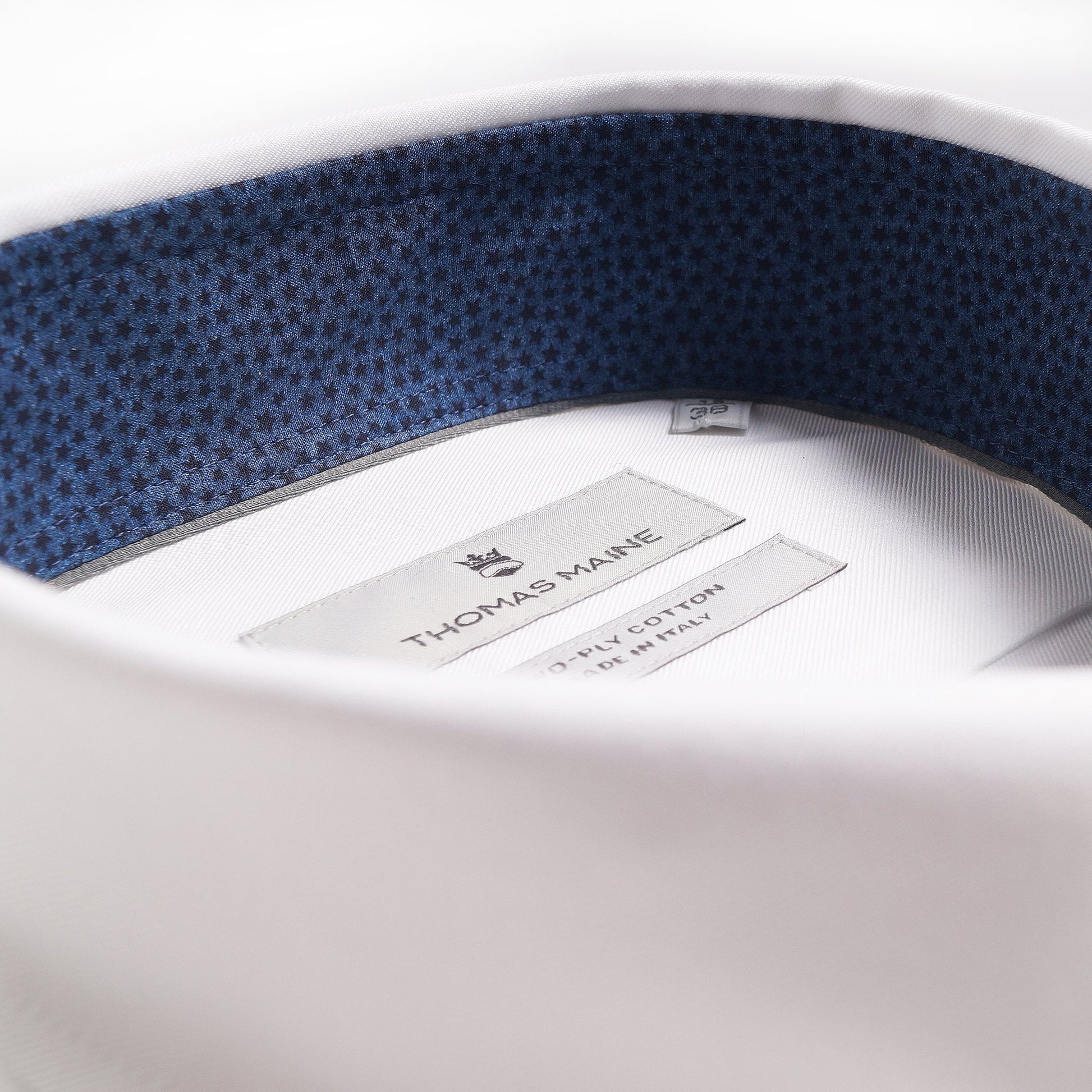 With more than five decades of experience in crafting premium tailored menswear, the Thomas Maine shirt collection offers quality apparel and a sophisticated look that is also affordable. Their distinctive style of effortless sophistication is evident in this crisp white shirt crafted in the finest two-ply Italian fabric. Two-ply fabrics are made of double twisted very fine yarns and this technical aspect creates very compact and luxurious fabrics, yet breathable and comfortable to wear. Crafted in a Albini fabric this shirt will last over time, maintaining its initial characteristics. Features of this stunning structured shirt include a blue mini star print insert on the collar and cuff, cutaway collar, navy sheen buttons, Thomas Maine crest on the cuff and square two buttoned adjustable cuff. This shirt will take you from modern business to smart casual and is a must-have this season!