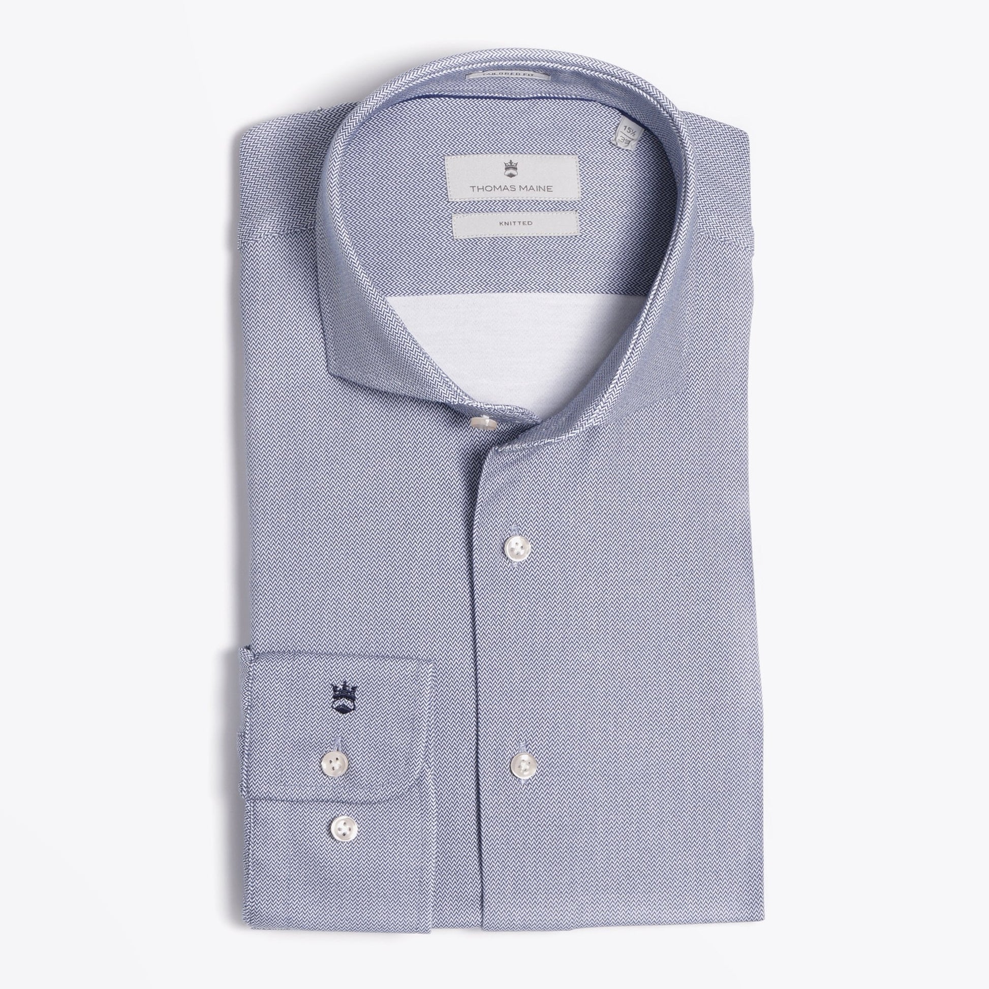 With more than five decades of experience in crafting premium tailored menswear, the Thomas Maine shirt collection offers quality apparel and a sophisticated look that is also affordable. Their distinctive style of effortless sophistication is evident in this knitted chevron shirt crafted in the finest Italian knitted cotton. It’s natural stretch characteristics gives extra comfort to the garment. Crafted in a Albini fabric this shirt will last over time, maintaining its initial characteristics. Features of this stunning structured shirt include a cutaway collar, white sheen buttons, Thomas Maine crest on the cuff and square two buttoned cuff. This shirt will take you from modern business to smart casual and is a must-have this season!