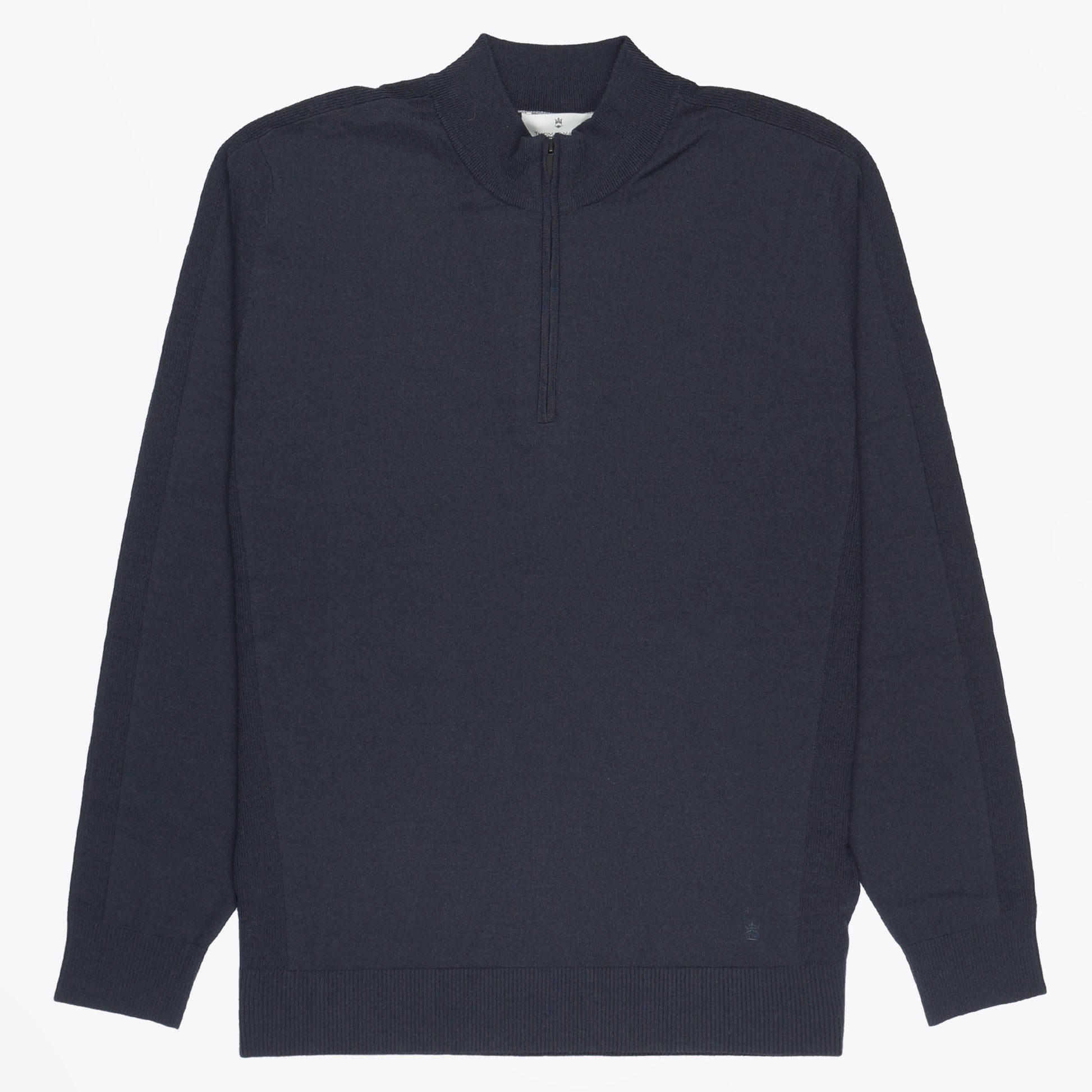 A classic yet contemporary brand, Thomas Maine is known for its sophisticated and masculine pieces. Crafted using the softest merino wool, this jumper is the perfect way to add a touch of luxury to your wardrobe this season. Crafted in a luxurious Merino wool, this navy zip neck features a rounded neckline, quarter zip fastening, Thomas Maine logo near the cuff, with ribbed cuffs and hem. This zip neck can be warm with some MMX trousers and some Veja sneakers.