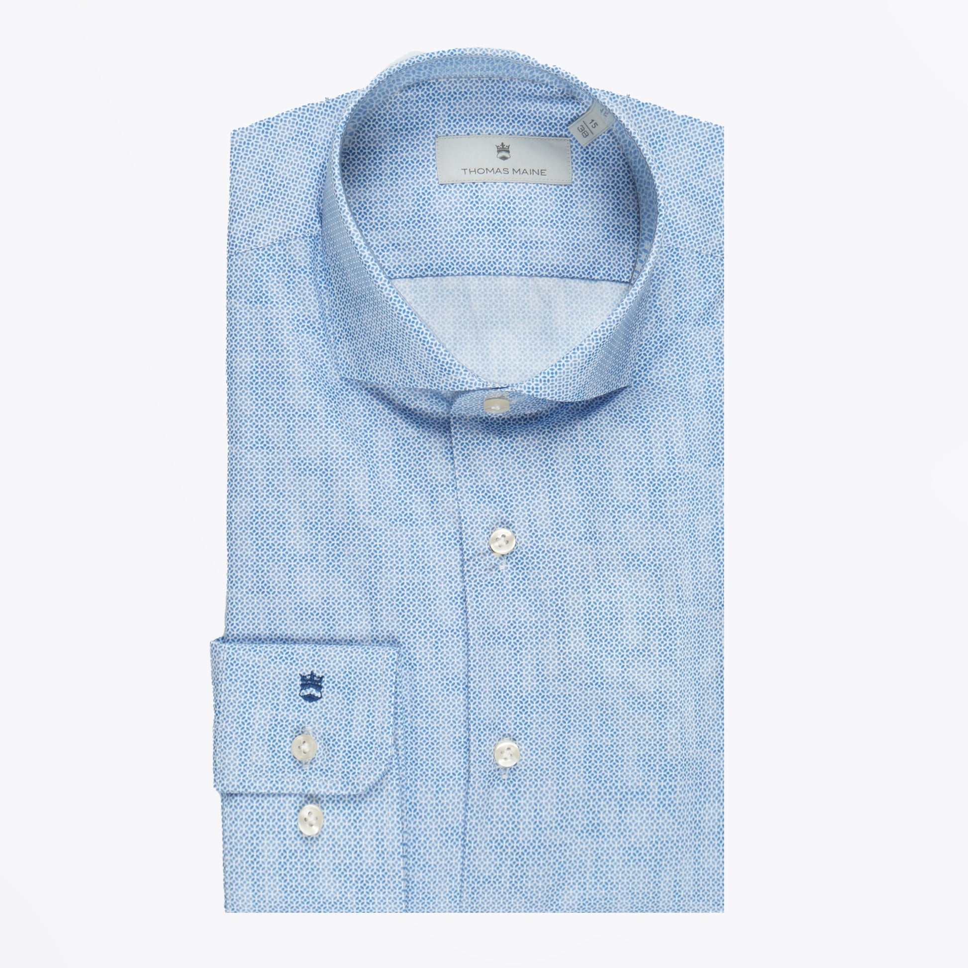 A classic yet contemporary brand, Thomas Maine is known for its sophisticated and masculine pieces. A great way to update your essential shirts this season, this shirt is crafted in a cotton material, and features a geometric print in a light blue shade, with a white mother of pearl button-down fastening, buttoned cuffs, and an embroidery of the Thomas Maine logo on the cuff in a navy blue thread. Wear this shirt under a smart jacket and with some MMX trousers for a great work look.