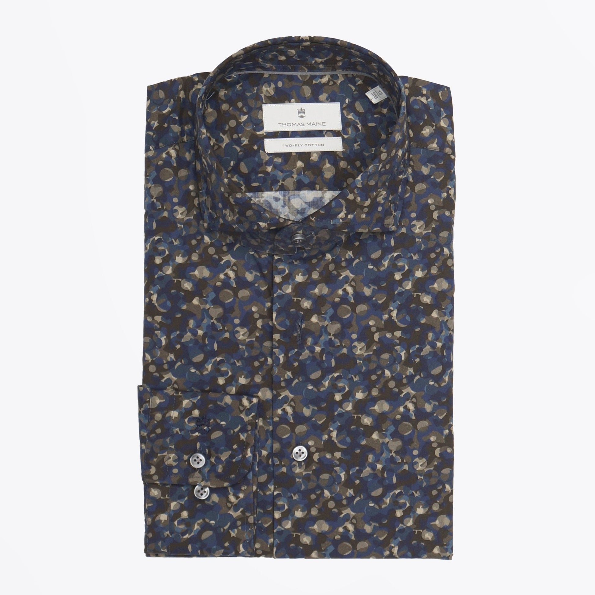 A classic yet contemporary brand, Thomas Maine is known for its sophisticated and masculine pieces. A great way to add some luxurious texture to your shirt collection this season, this shirt is crafted from a soft, two-ply cotton. This shirt features an abstract spherical pattern in shades of blue, white, and great. This short has a blue/grey button-down fastening, a double buttoned cuff, and an embroidery of the Thomas Maine logo on the cuff. Wear this shirt with a pair of MMX chinos and some leather shoes for a great workwear attire.