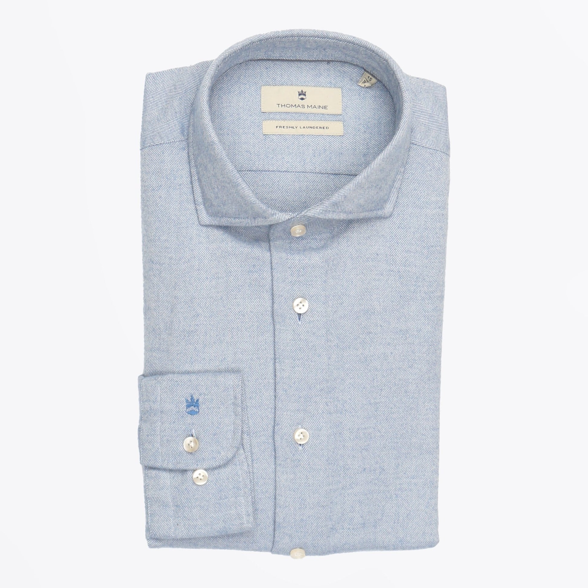 A classic yet contemporary brand, Thomas Maine is known for its sophisticated and masculine pieces. A great way to add some luxurious texture to your shirt collection this season, this shirt is crafted from a soft, slightly brushed cotton. This shirt features a herringbone pattern in blue and white, with a button-down fastening, collared neckline, double buttoned cuffs, and an embroidery of the Thomas main logo on the right cuffs. Wear this shirt with a pair of MMX chinos and some leather shoes for a great workwear attire.