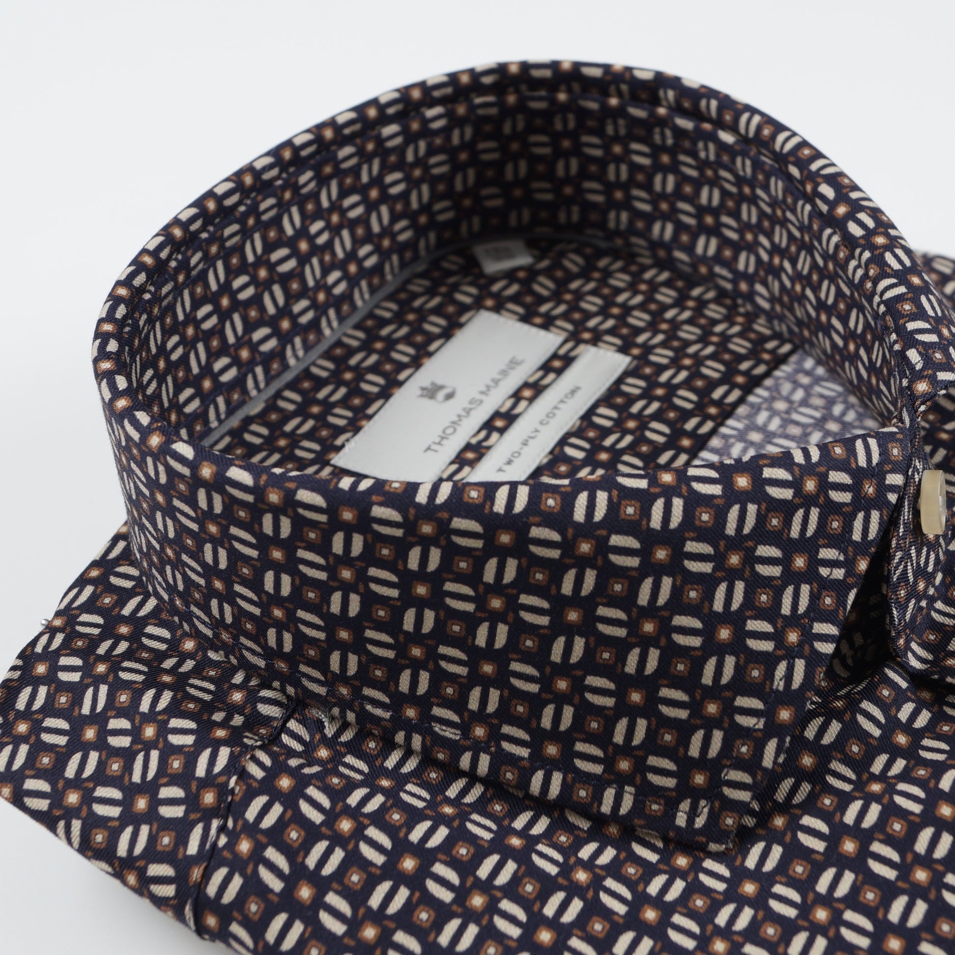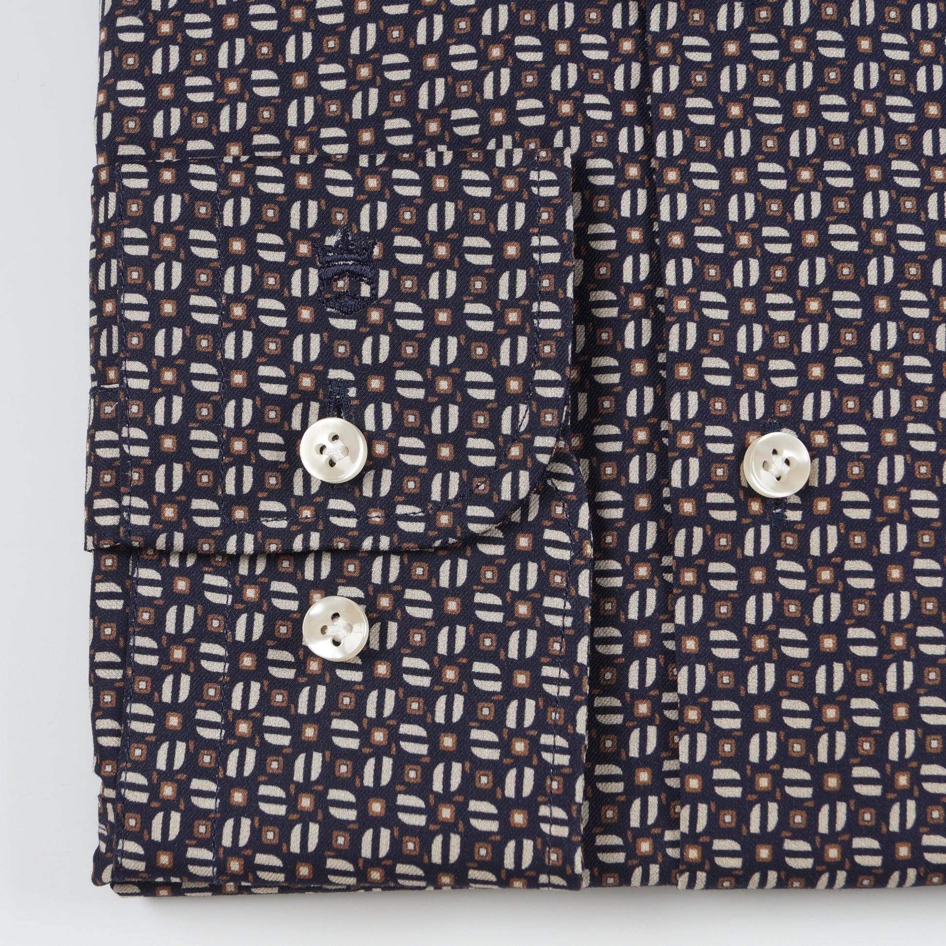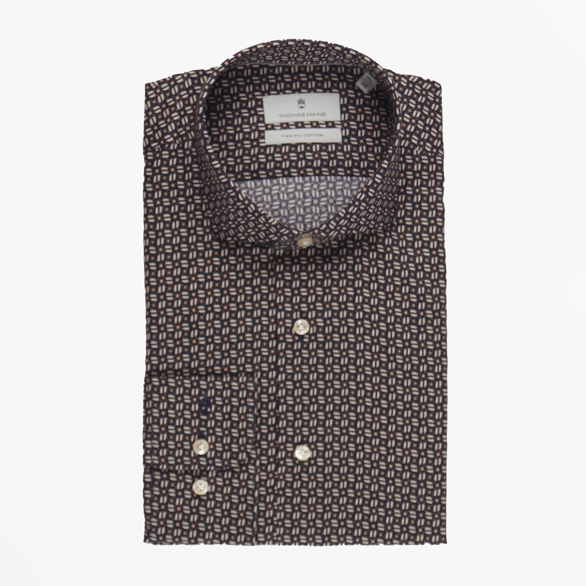A classic yet contemporary brand, Thomas Maine is known for its sophisticated and masculine pieces. A great way to incorporate intricate print into your work attire, this shirt is crafted in a two-ply cotton material, and features a geometric print in shades of navy, ochre and off-white, with a white mother of pearl button-down fastening, buttoned cuffs, and an embroidery of the Thomas Maine logo on the cuff in a navy thread. Wear this shirt under a smart jacket and with some MMX trousers for a great work look.
